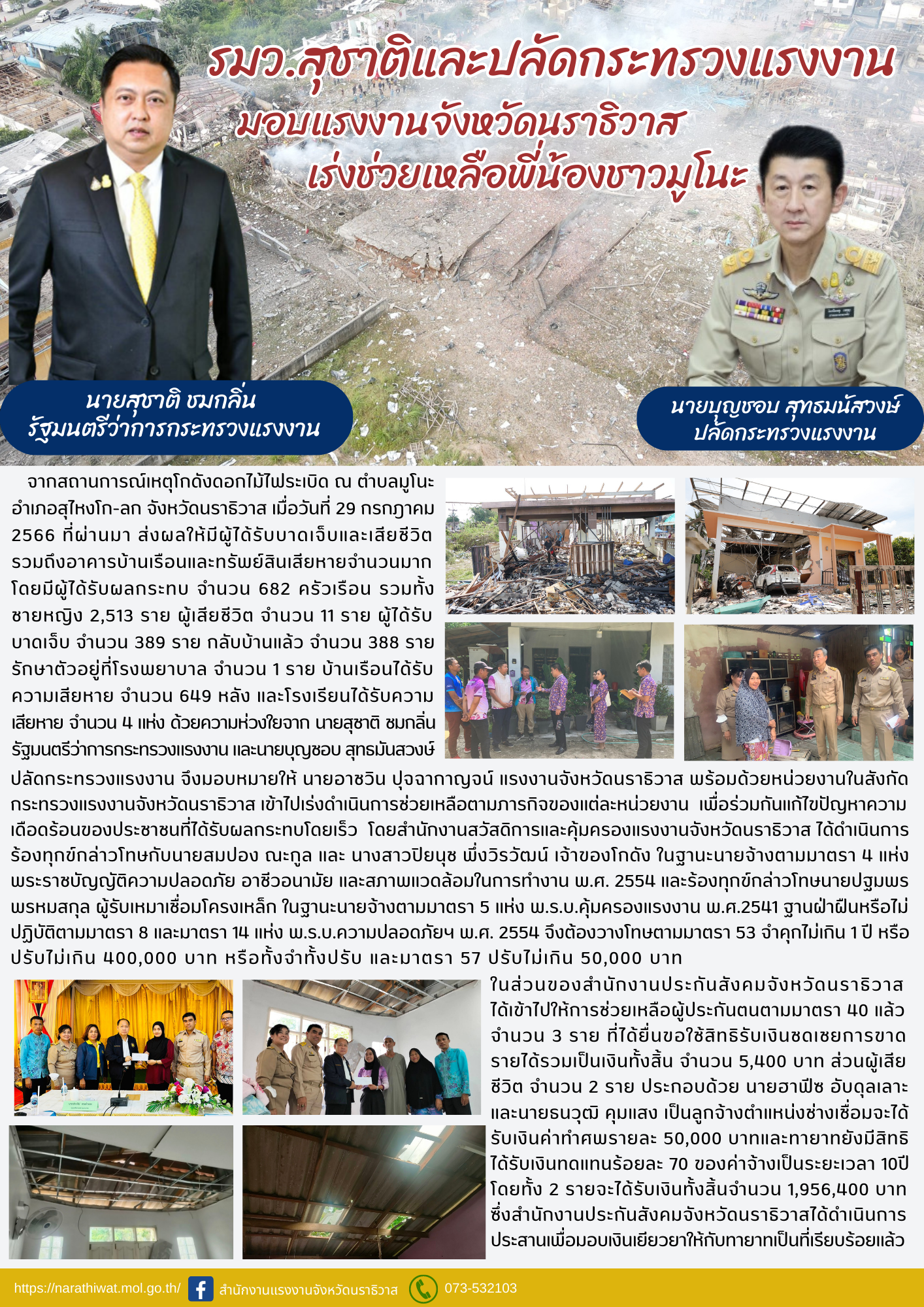 จากสถานการณ์เหตุโกดังดอกไม้ไฟระเบิด ณ ตำบลมูโนะ อำเภอสุไหงโก-ลก จังหวัดนราธิวาส เมื่อวันที่ 29 กรกฎาคม 2566 ที่ผ่านมา ส่งผลให้มีผู้ได้รับบาดเจ็บและเสียชีวิต รวมถึงอาคารบ้านเรือนและทรัพย์สินเสียหายจำนวนมาก โดยมีผู้ได้รับผลกระทบ จำนวน 682 ครัวเรือน รวมทั้งชายหญิง 2,513 ราย ผู้เสียชีวิต จำนวน 11 ราย ผู้ได้รับบาดเจ็บ จำนวน 389 ราย กลับบ้านแล้ว จำนวน 388 ราย รักษาตัวอยู่ที่โรงพยาบาล จำนวน 1 ราย บ้านเรือนได้รับความเสียหาย จำนวน 649 หลัง และโรงเรียนได้รับความเสียหาย จำนวน 4 แห่ง ด้วยความห่วงใยจาก นายสุชาติ ชมกลิ่น รัฐมนตรีว่าการกระทรวงแรงงาน และนายบุญชอบ สุทธมันสวงษ์ ปลัดกระทรวงแรงงาน จึงมอบหมายให้ นายอาชวิน ปุจฉากาญจน์ แรงงานจังหวัดนราธิวาส พร้อมด้วยหน่วยงานในสังกัดกระทรวงแรงงานจังหวัดนราธิวาส เข้าไปเร่งดำเนินการช่วยเหลือตามภารกิจของแต่ละหน่วยงาน เพื่อร่วมกันแก้ไขปัญหาความเดือดร้อนของประชาชนที่ได้รับผลกระทบโดยเร็ว โดยสำนักงานสวัสดิการและคุ้มครองแรงงานจังหวัดนราธิวาส ได้ดำเนินการร้องทุกข์กล่าวโทษกับนายสมปอง ณะกูล และ นางสาวปิยนุช พึ่งวิรวัฒน์ เจ้าของโกดัง ในฐานะนายจ้างตามมาตรา 4 แห่งพระราชบัญญัติความปลอดภัย อาชีวอนามัย และสภาพแวดล้อมในการทำงาน พ.ศ. 2554 และร้องทุกข์กล่าวโทษนายปฐมพร พรหมสกุล ผู้รับเหมาเชื่อมโครงเหล็ก ในฐานะนายจ้างตามมาตรา 5 แห่ง พ.ร.บ.คุ้มครองแรงงาน พ.ศ.2541 ฐานฝ่าฝืนหรือไม่ปฏิบัติตามมาตรา 8 และมาตรา 14 แห่ง พ.ร.บ.ความปลอดภัยฯ พ.ศ. 2554 จึงต้องวางโทษตามมาตรา 53 จำคุกไม่เกิน 1 ปี หรือปรับไม่เกิน 400,000 บาท หรือทั้งจำทั้งปรับ และมาตรา 57 ปรับไม่เกิน 50,000 บาท ในส่วนของสำนักงานประกันสังคมจังหวัดนราธิวาส ได้เข้าไปให้การช่วยเหลือผู้ประกันตนตามมาตรา 40 แล้วจำนวน 3 ราย ที่ได้ยื่นขอใช้สิทธิรับเงินชดเชยการขาดรายได้รวมเป็นเงินทั้งสิ้น จำนวน 5,400 บาท ส่วนผู้เสียชีวิต จำนวน 2 ราย ประกอบด้วย นายฮาฟีซ อับดุลเลาะ และนายธนวุฒิ คุมแสง เป็นลูกจ้างตำแหน่งช่างเชื่อม จะได้รับเงินค่าทำศพรายละ 50,000 บาทและทายาทยังมีสิทธิได้รับเงินทดแทนร้อยละ 70 ของค่าจ้างเป็นระยะเวลา 10ปี โดยทั้ง 2 รายจะได้รับเงินทั้งสิ้นจำนวน 1,956,400 บาท ซึ่งสำนักงานประกันสังคมจังหวัดนราธิวาสได้ดำเนินการประสานเพื่อมอบเงินเยียวยาให้กับทายาทเป็นที่เรียบร้อยแล้ว นอกจากนี้ หน่วยงานในสังกัดกระทรวงแรงงานได้มีการประสานความร่วมมือกับส่วนต่างๆในการร่วมกันช่วยซ่อมแซมบ้านเรือนให้กับพี่น้องประชาชนที่ได้รับความเสียหายเพื่อให้สามารถเข้าอยู่อาศัยได้ โดยเฉพาะบัณฑิตแรงงานได้ร่วม