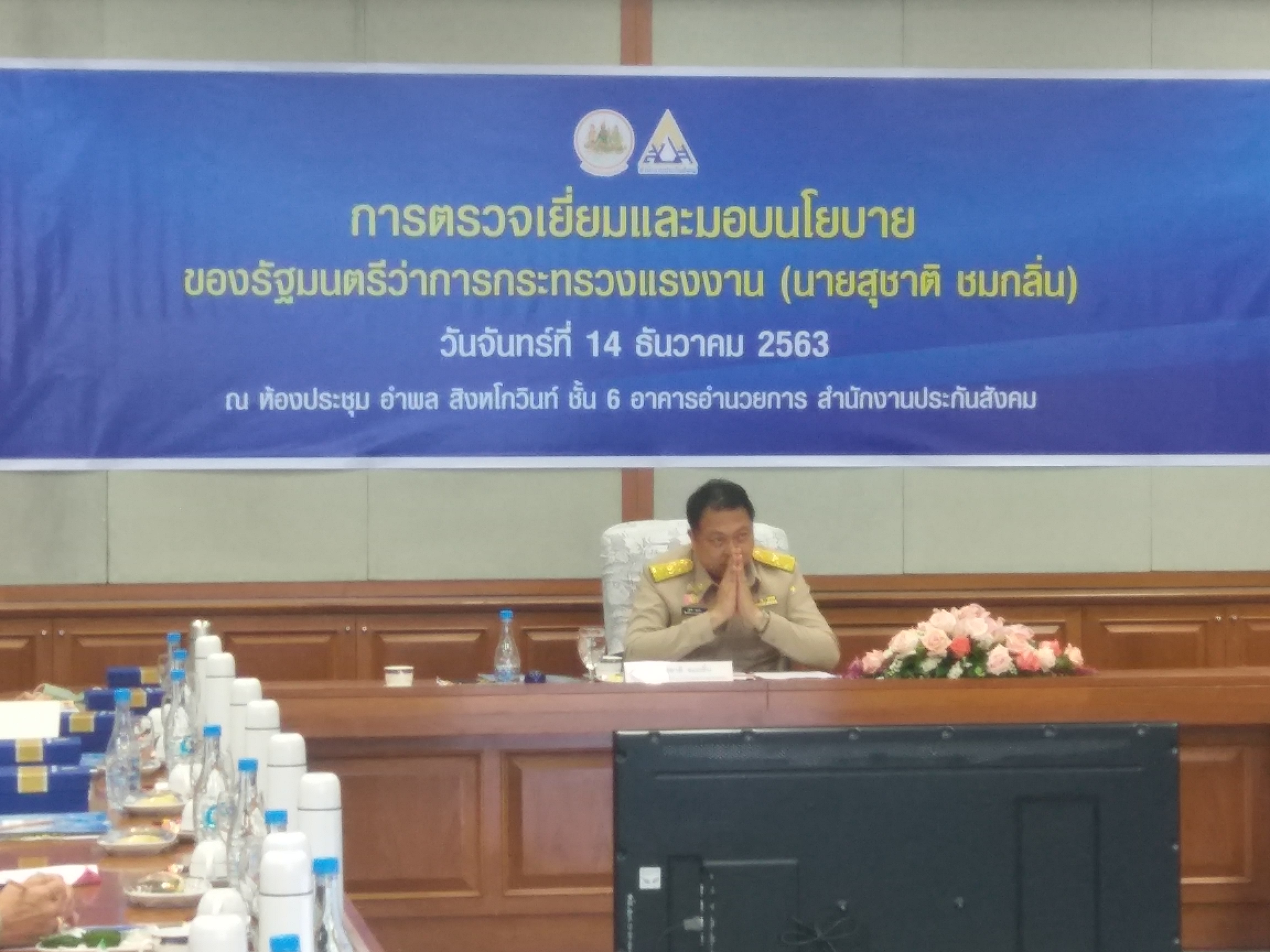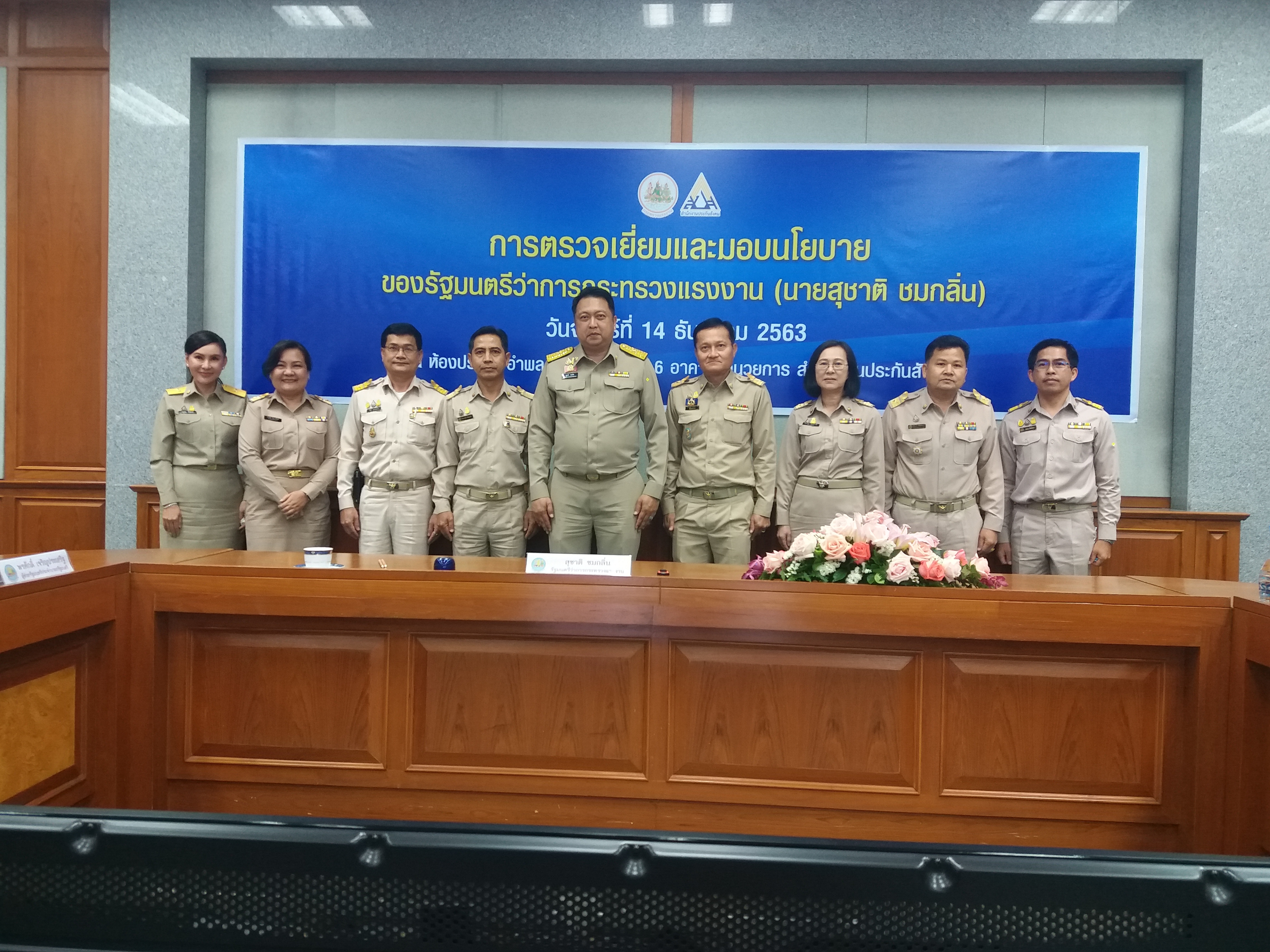วันที่ 14 ธันวาคม 2563 เวลา 8.30 น. นายสุจินต์ ไชยชุมศักดิ์ ผู้ว่าราชการจังหวัดนนทบุรี พร้อมด้วยนายวิชิตร สุวรรณมาก แรงงานจังหวัดนนทบุรี นางอนุวรรณ แสงประเสริฐ จัดหางานจังหวัดนนทบุรี นายอัครินทร์ ธารีฉัตรไพศาล สวัสดิการและคุ้มครองจังหวัดนนทบุรี นายสงกรานต์ เพิ่มฤๅชัย ผู้อำนวยการสำนักงานพัฒนาฝีมือแรงงานนนทบุรี และนางชวนพิศ วิระวงษ์นุสร ประกันสังคมจังหวัดนนทบุรี ร่วมต้อนรับ นายสุชาติ ชมกลิ่น รัฐมนตรีว่าการกระทรวงแรงงานและคณะ เพื่อตรวจเยี่ยมและมอบนโยบายแก่สำนักงานประกันสังคม ณ ห้องประชุม อำพล สิงหโกวินท์ ชั้น 6 อาคารอำนวยการ สำนักงานประกันสังคม ถนนติวานนท์ จังหวัดนนทบุรี โดยรัฐมนตรีว่าการกระทรวงแรงงานให้นโยบายสำคัญในการผลักดันให้แรงงานอิสระหรือแรงงานนอกระบบเข้าสู่ระบบประกันสังคม และการพัฒนากระบวนการให้บริการประกันสังคมและบริการทางการแพทย์ให้ดีขึ้น เพื่อตอบสนองความต้องการให้แก่ผู้ประกันตน อาทิ การให้ความช่วยเหลือแรงงานที่ได้รับความรู้อย่างทันท่วงที การให้ความสำคัญกับมาตรการป้องกันมากกว่าการแก้ไขปัญหา การจัดตั้งสำนักงานประกันสังคมเพิ่ม การจัดตั้งศูนย์ฟื้นฟู การจัดทำฐานข้อมูล Big Data การจัดมุมบริการผู้ประกันตน และการมีจิตบริการที่ดี เป็นต้น