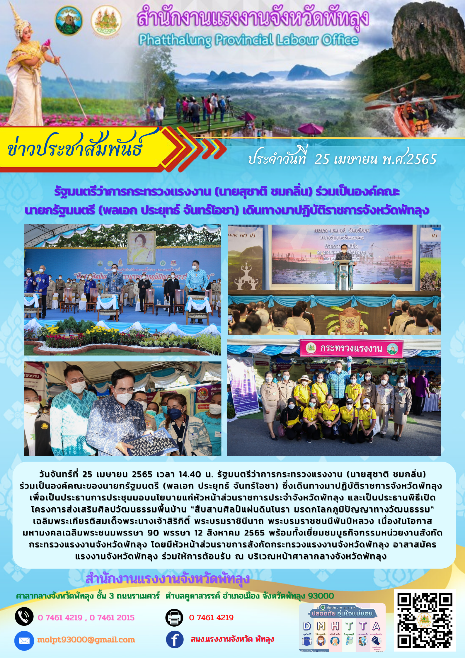 วันจันทร์ที่ 25 เมษายน 2565 เวลา 14.40 น. รัฐมนตรีว่าการกระทรวงแรงงาน (นายสุชาติ ชมกลิ่น) ร่วมเป็นองค์คณะของนายกรัฐมนตรี (พลเอก ประยุทธ์ จันทร์โอชา) ซึ่งเดินทางมาปฏิบัติราชการจังหวัดพัทลุง เพื่อเป็นประธานการประชุมมอบนโยบายแก่หัวหน้าส่วนราชการประจำจังหวัดพัทลุง และเป็นประธานเปิดโครงการส่งเสริมศิลปวัฒนธรรมพื้นบ้าน “สืบสานศิลป์แผ่นดินโนรา มรดกโลกภูมิปัญญาทางวัฒนธรรม” เฉลิมพระเกียรติสมเด็จพระนางเจ้าสิริกิติ์ พระบรมราชินีนาถ พระบรมราชชนนีพันปีหลวง เนื่องในโอกาสมหามงคลเฉลิมพระชนมพรรษา 90 พรรษา 12 สิงหาคม 2565 พร้อมทั้งเยี่ยมชมบูธกิจกรรมหน่วยงานสังกัดกระทรวงแรงงานจังหวัดพัทลุง โดยมีหัวหน้าส่วนราขการสังกัดกระทรวงแรงงานจังหวัดพัทลุง อาสาสมัครแรงงานจังหวัดพัทลุง ร่วมให้การต้อนรับ ณ บริเวณหน้าศาลากลางจังหวัดพัทลุง