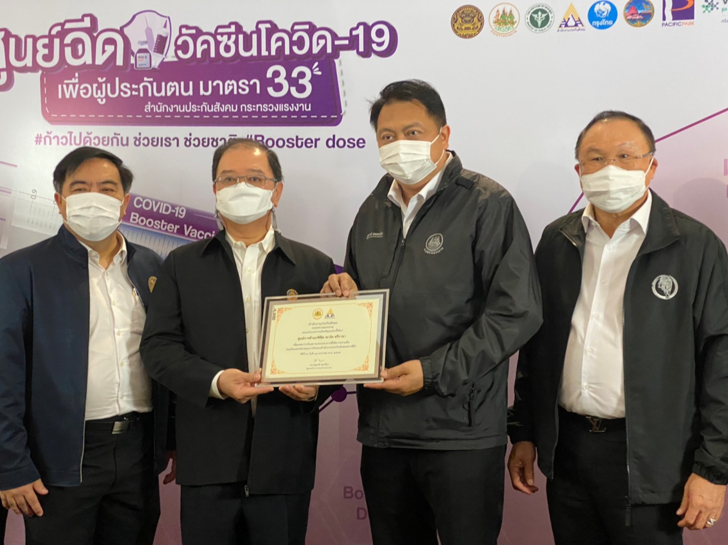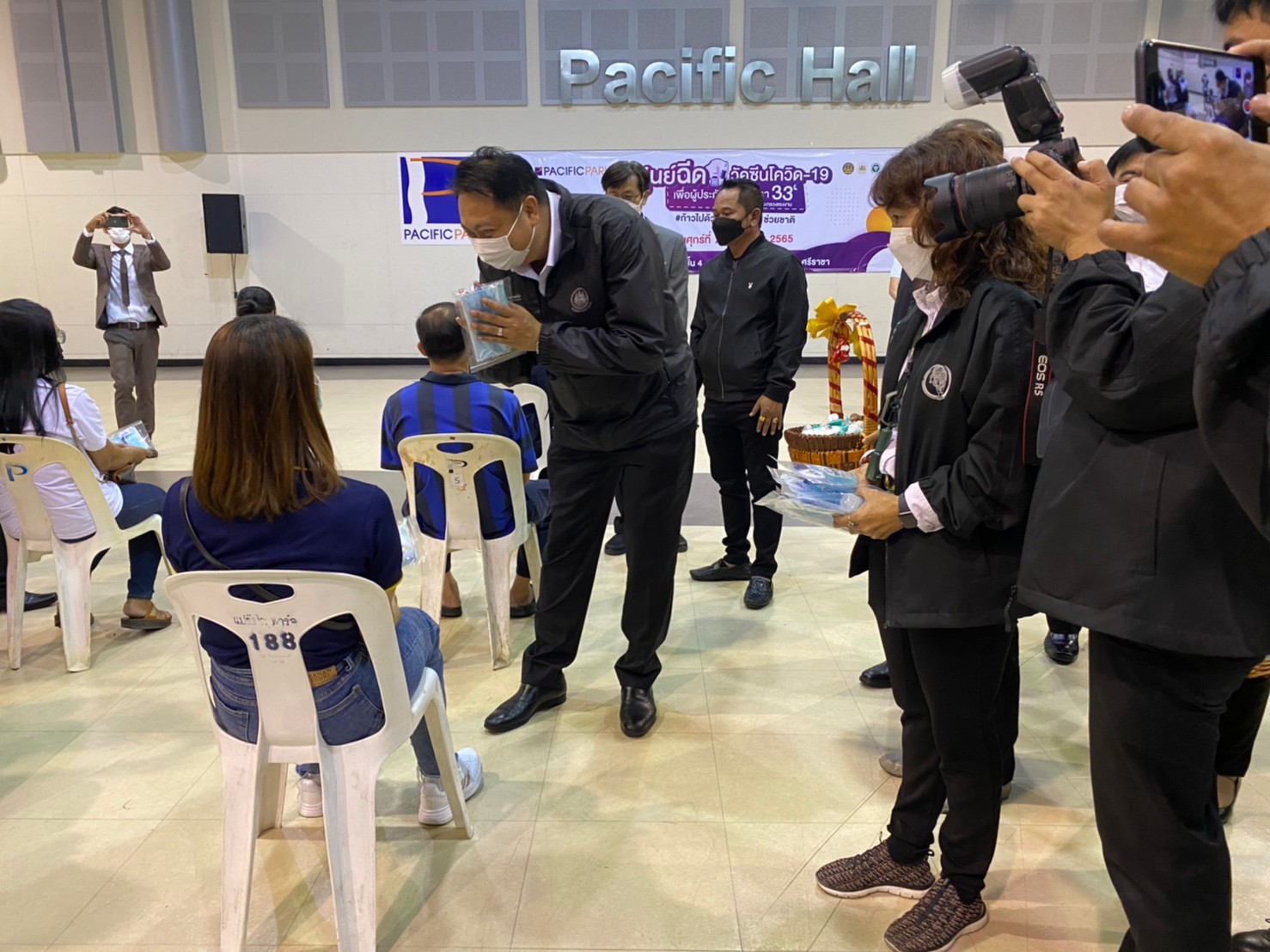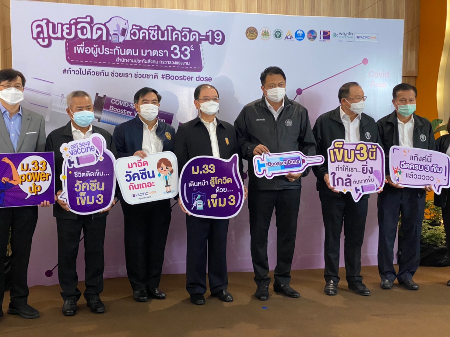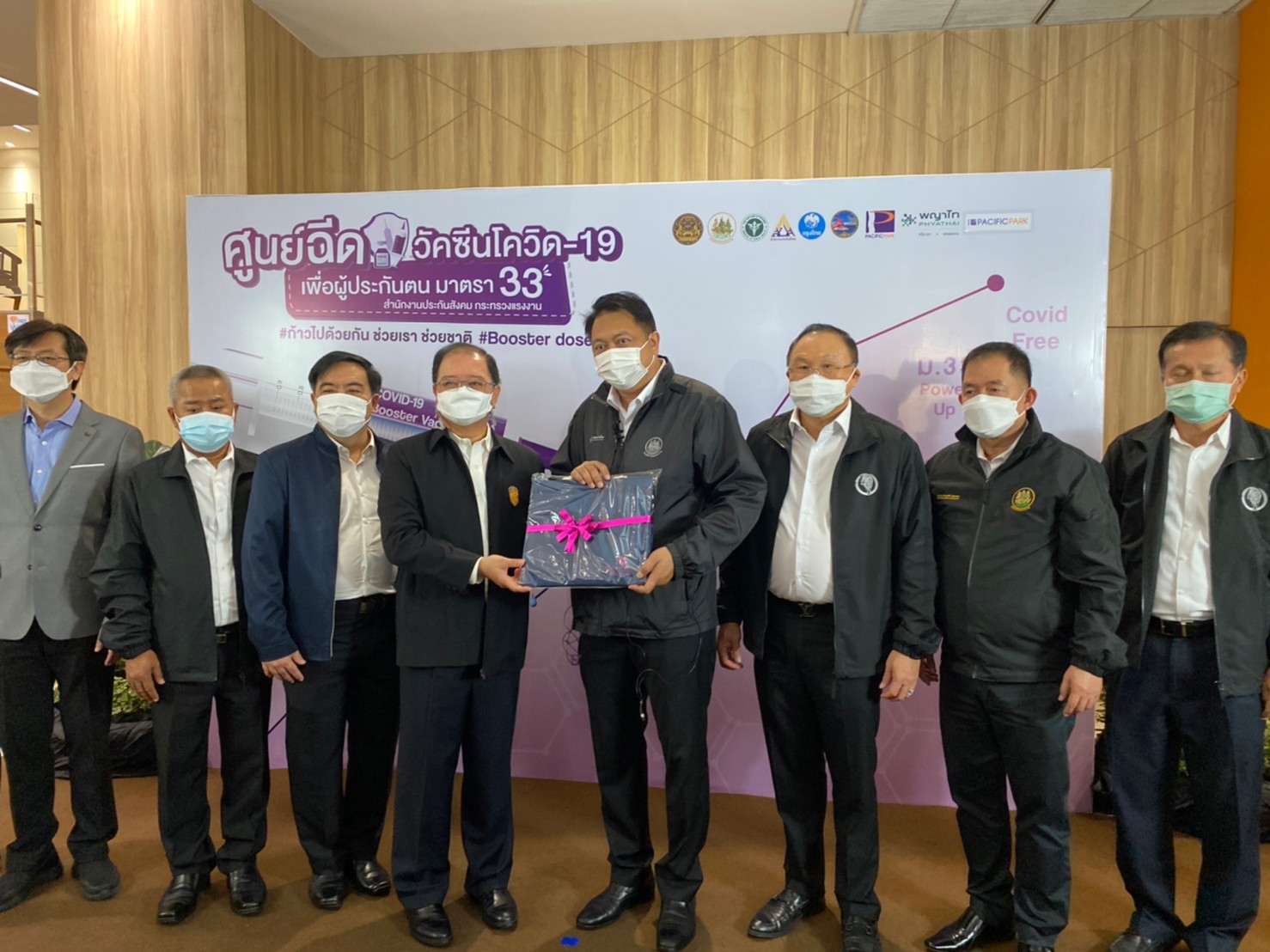 วันศุกร์ที่ 21 มกราคม 2565 เวลา 13.00 น. นายสุชาติ ชมกลิ่น รัฐมนตรีว่าการกระทรวงแรงงาน พร้อมด้วยผู้บริหารระดับสูงกระทรวงแรงงานลงพื้นที่ตรวจเยี่ยมและให้กำลังใจผู้ประกันตนมาตรา 33 ที่มาฉีดวัคซีนโควิด-19 เข็ม 3 (Booster Dose) ณ ศูนย์ฉีดวัคซีนโควิด-19 เพื่อผู้ประกันตน ม. 33 ณ ศูนย์การค้าแปซิฟิค พาร์ค ศรีราชา โดยมี นายนิติ วิวัฒน์วานิช รองผู้ว่าราชการจังหวัดชลบุรี นายสมบูรณ์ วรปัญญาสกุล กรรมการผู้จัดการศูนย์การค้าแปซิฟิค พาร์ค ศรีราชา นางสาวกรจิรัฏฐ์ พงจันทร์ศธร แรงงานจังหวัดชลบุรี นายสราวุธ สุขสวรรค์ ประกันสังคมจังหวัดชลบุรี นายสมศักดิ์ โยชน์เมืองไพร หัวหน้าสำนักงานประกันสังคมจังหวัดชลบุรี สาขา ศรีราชา และนายเบญจรงค์ ว่องจรรยากุล หัวหน้าสำนักงานประกันสังคมจังหวัดชลบุรี สาขาบางละมุง พร้อมด้วยหัวหน้าส่วนราชการสังกัดกระทรวงแรงงานจังหวัดชลบุรีร่วมให้การต้อนรับโดยพร้อมเพรียงกัน