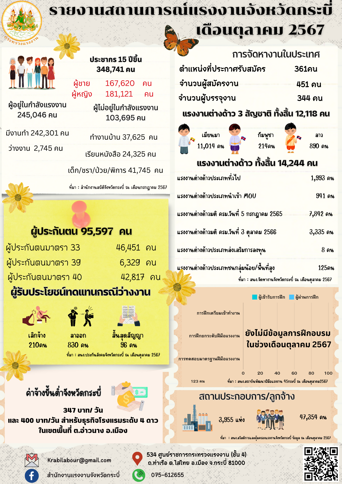 รายงานสถานการณ์แรงงานจังหวัดกระบี่ ประจำเดือน ตุลาคม 2567