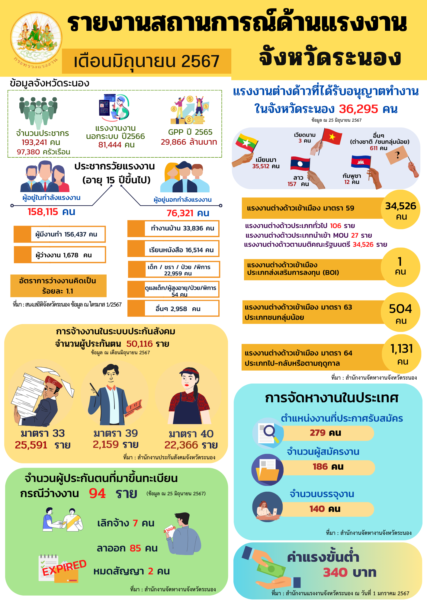 สรจ.ระนอง รายงานสถานการณ์และดัชนีชี้วัดภาวะแรงงานจังหวัด เดือนมิถุนายน 2567