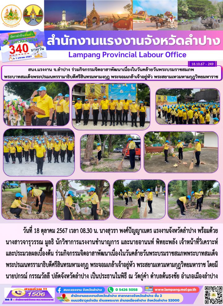 วันที่ 18 ตุลาคม 2567 เวลา 08.30 น. นางสุวรา พงศ์ปัญญาเนตร แรงงานจังหวัดลำปาง พร้อมด้วย นางสาวจารุวรรณ มูลธิ นักวิชาการแรงงานชำนาญการ และนายอานนท์ พิทยะพลัง เจ้าหน้าที่วิเคราะห์และประมวลผลเบื้องต้น ร่วมกิจกรรมจิตอาสาพัฒนาเนื่องในวันคล้ายวันพระบรมราชสมภพพระบาทสมเด็จพระปรเมนทรรามาธิบดีศรีสินทรมหามงกุฎ พระจอมเกล้าเจ้าอยู่หัว พระสยามเทวมหามกุฎวิทยมหาราช โดยมีนายปกรณ์ กรรณวัลลี ปลัดจังหวัดลำปาง เป็นประธานในพิธี ณ วัดกู่คำ ตำบลต้นธงชัย อำเภอเมืองลำปาง