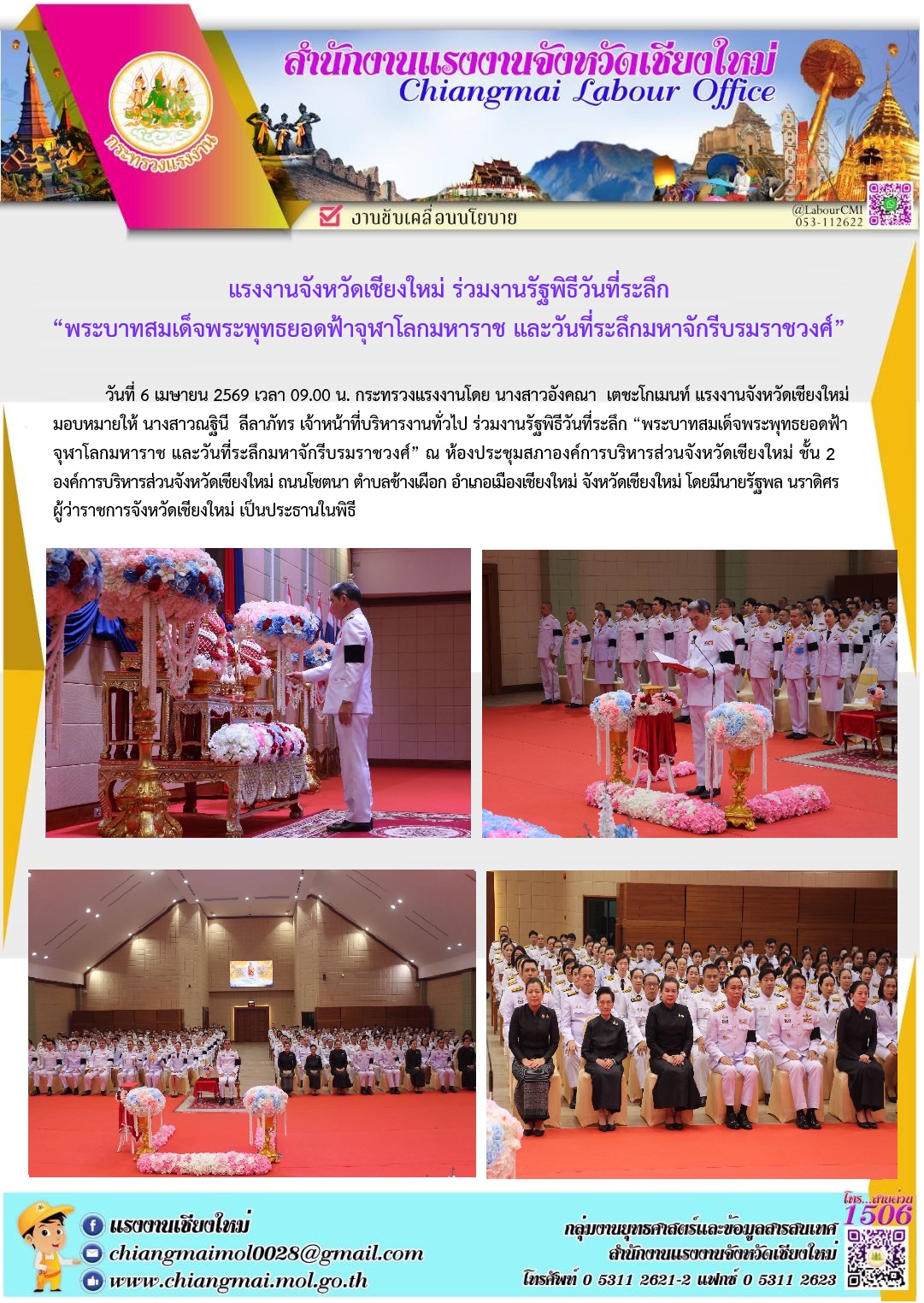 แรงงานเชียงใหม่ ร่วมงานรัฐพิธีวันที่ระลึก "พระบาทสมเด็จพระพุทธยอดฟ้าจุฬาโลกมหาราช และวันที่ระลึกมหาจักรีบรมราชวงศ์"