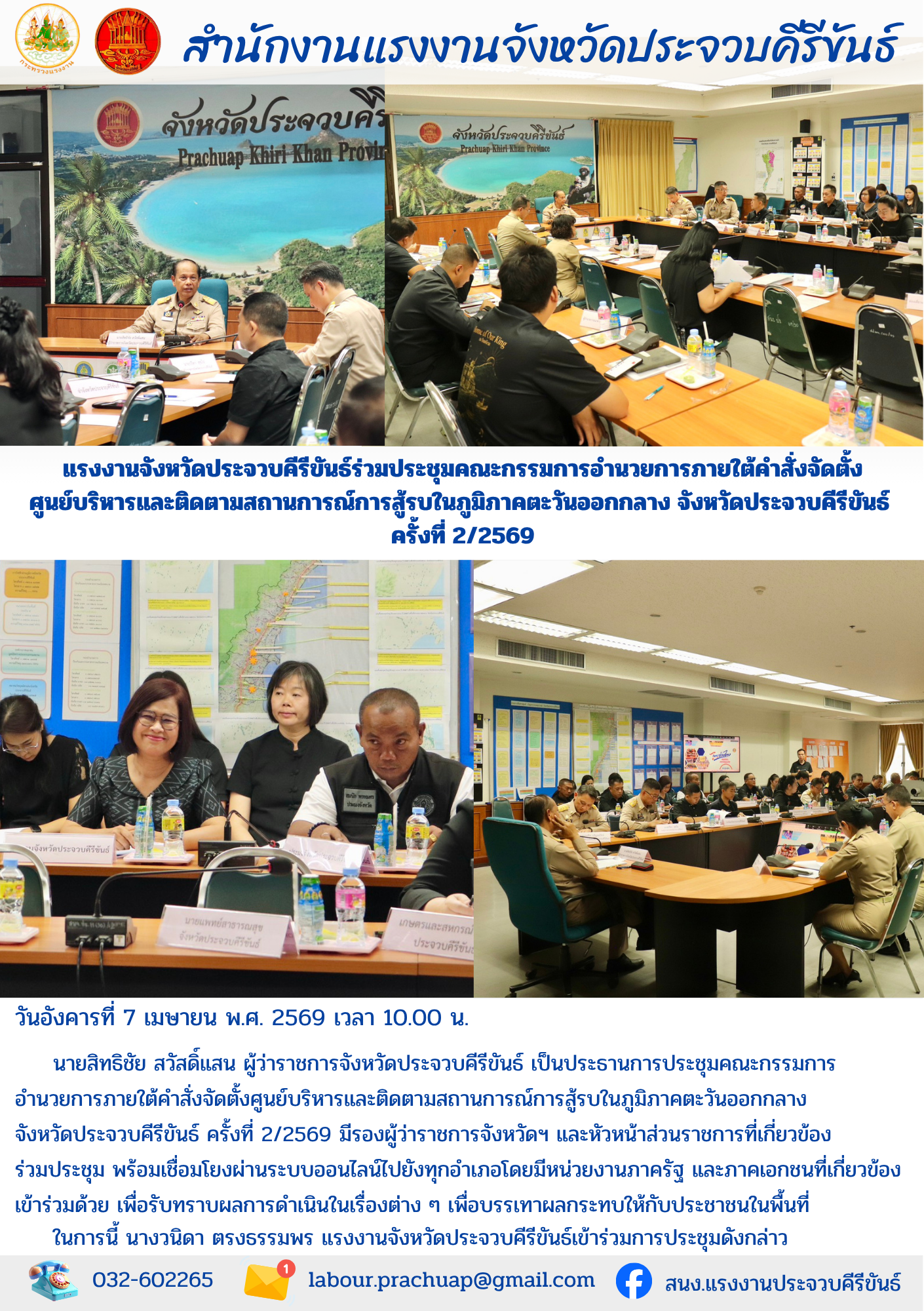 แรงงานจังหวัดประจวบคีรีขันธ์ร่วมประชุมคณะกรรมการอำนวยการภายใต้คำสั่งจัดตั้ง ศูนย์บริหารและติดตามสถานการณ์การสู้รบในภูมิภาคตะวันออกกลาง จังหวัดประจวบคีรีขันธ์ ครั้งที่ 2/2569