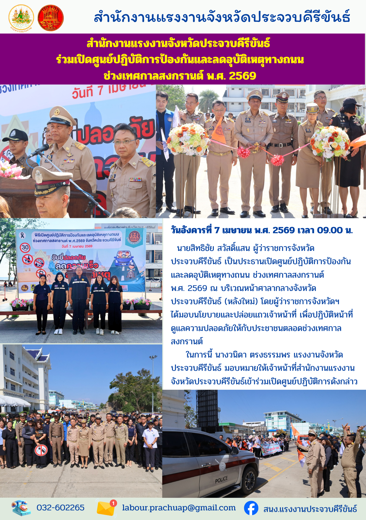 สำนักงานแรงงานจังหวัดประจวบคีรีขันธ์ ร่วมเปิดศูนย์ปฏิบัติการป้องกันและลดอุบัติเหตุทางถนน ช่วงเทศกาลสงกรานต์ พ.ศ. 2569