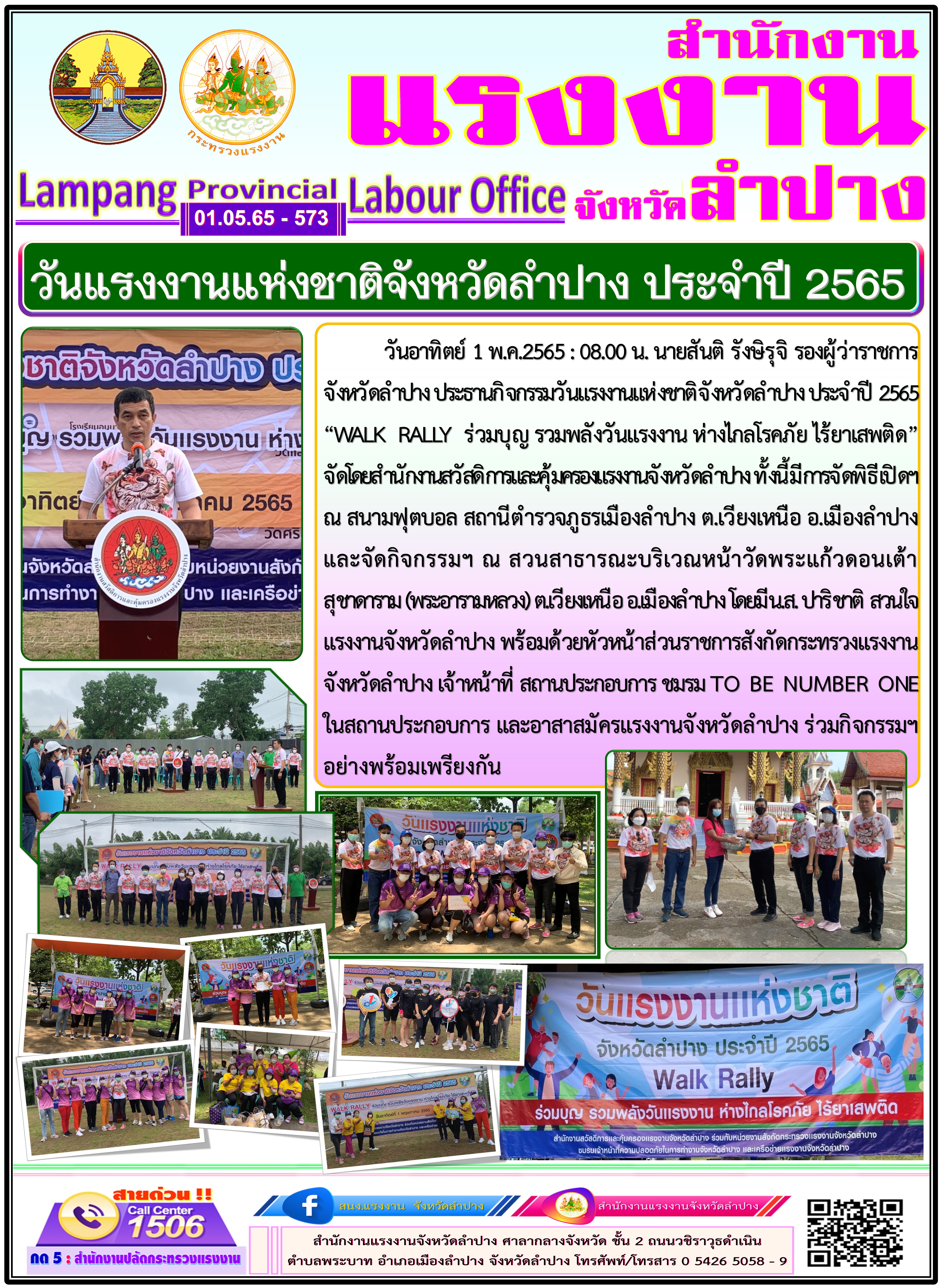วันอาทิตย์ 1 พ.ค.2565 : 08.00 น. นายสันติ รังษิรุจิ รองผู้ว่าราชการจังหวัดลำปาง ประธานกิจกรรมวันแรงงานแห่งชาติจังหวัดลำปาง ประจำปี 2565 “WALK RALLY ร่วมบุญ รวมพลังวันแรงงาน ห่างไกลโรคภัย ไร้ยาเสพติด” จัดโดยสำนักงานสวัสดิการและคุ้มครองแรงงานจังหวัดลำปาง ทั้งนี้มีการจัดพิธีเปิดฯ ณ สนามฟุตบอล สถานีตำรวจภูธรเมืองลำปาง ต.เวียงเหนือ อ.เมืองลำปาง และจัดกิจกรรมฯ ณ สวนสาธารณะบริเวณหน้าวัดพระแก้วดอนเต้าสุชาดาราม (พระอารามหลวง) ต.เวียงเหนือ อ.เมืองลำปาง โดยมีน.ส. ปาริชาติ สวนใจ แรงงานจังหวัดลำปาง พร้อมด้วยหัวหน้าส่วนราชการสังกัดกระทรวงแรงงานจังหวัดลำปาง เจ้าหน้าที่ สถานประกอบการ ชมรม TO BE NUMBER ONE ในสถานประกอบการ และอาสาสมัครแรงงานจังหวัดลำปาง ร่วมกิจกรรมฯ อย่างพร้อมเพรียงกัน