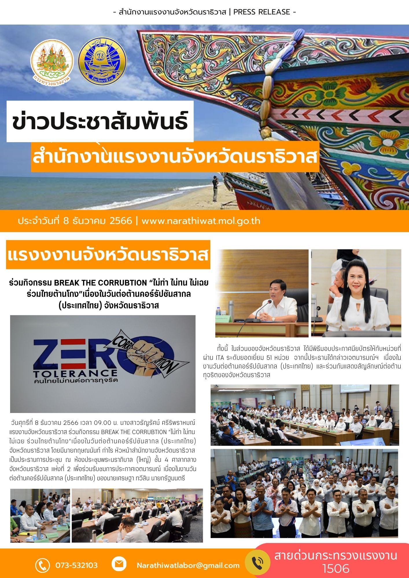 วันศุกรืที่ 8 ธันวาคม 2566 เวลา 09.00 น. นางสาวธัญรัศม์ ศรีริพราหมณ์ แรงงานจังหวัดนราธิวาส ร่วมกิจกรรม BREAK THE CORRUBTION “ไม่ทำ ไม่ทน ไม่เฉย ร่วมไทยต้านโกง”เนื่องในวันต่อต้านคอร์รัปชันสากล (ประเทศไทย) จังหวัดนราธิวาส โดยมีนายกฤษณนันท์ กำไร หัวหน้าสำนักงานจังหวัดนราธิวาส เป็นประธานการประชุม ณ ห้องประชุมพระนราภิบาล (ใหญ่) ชั้น 4 ศาลากลางจังหวัดนราธิวาส แห่งที่ 2 เพื่อร่วมรับชมการประกาศเจตนารมณ์ เนื่องในงานวันต่อต้านคอร์รัปขันสากล (ประเทศไทย) ของนายเศรษฐา ทวีสิน นายกรัฐมนตรี ทั้งนี้ ในส่วนของจังหวัดนราธิวาส ได้มีพิธีมอบประกาศนียบัตรให้กับหน่วยที่ผ่าน ITA ระดับยอดเยี่ยม 51 หน่วย จากนั้ประธานได้กล่าวเจตนารมณ์ฯ เนื่องในงานวันต่อต้านคอร์รัปขันสากล (ประเทศไทย) และร่วมกันแสดงสัญลักษณ์ต่อต้านทุจริตของจังหวัดนราธิวาส