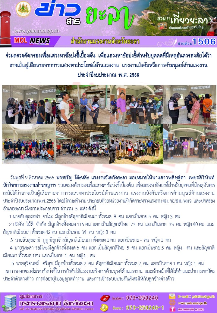 สรจ.ยะลา ร่วมตรวจคัดกรองเพื่อแสวงหาข้อบ่งชี้เบื้องต้น เพื่อแสวงหาข้อบ่งชี้สำหรับบุคคลที่มีเหตุอันควรสงสัยได้ว่าอาจเป็นผู้เสียหายจากการแสวงหาประโยชน์ด้านแรงงาน แรงงานบังคับหรือการค้ามนุษย์ด้านแรงงาน ประจำปีงบประมาณ พ.ศ. 2566