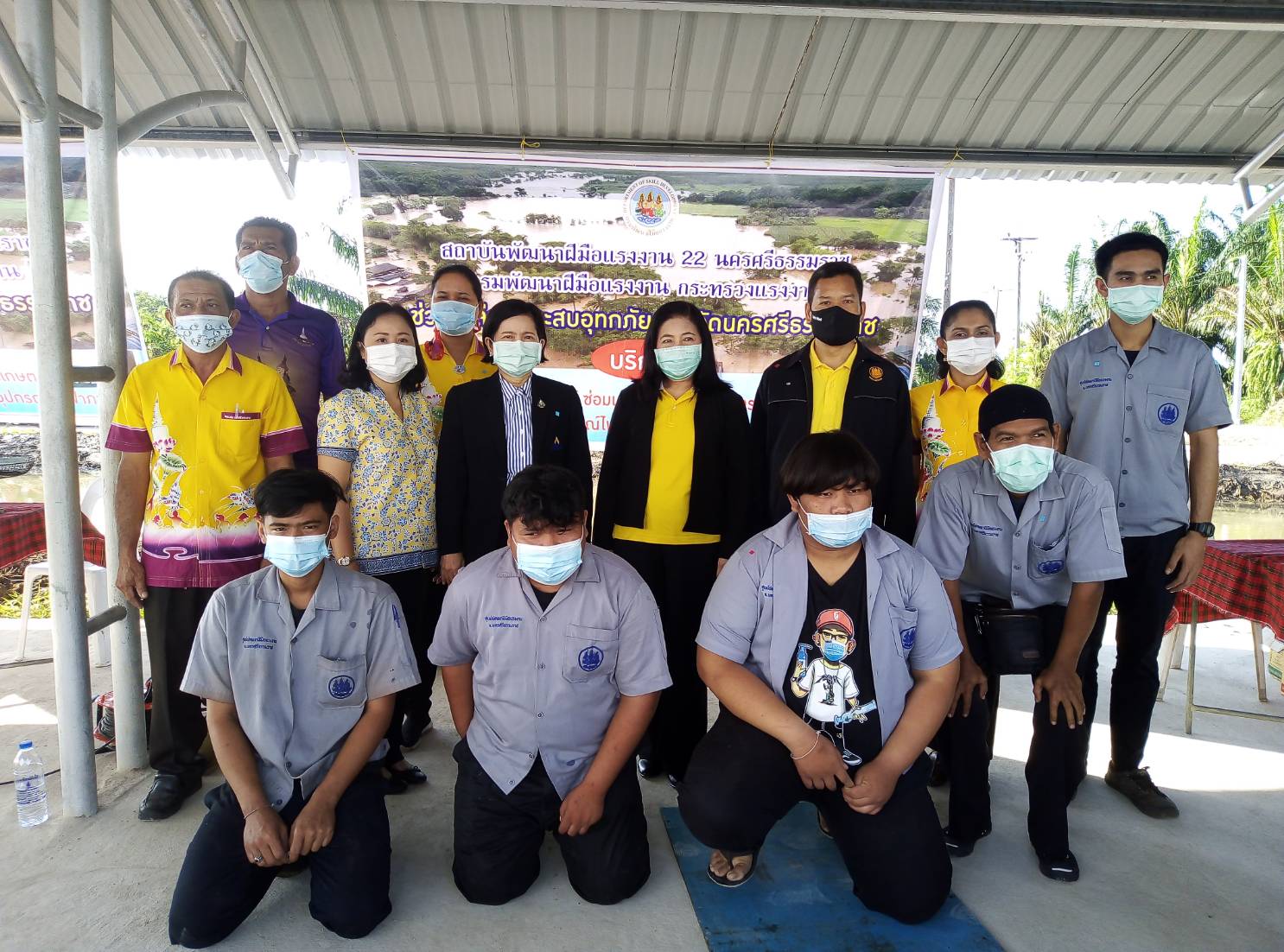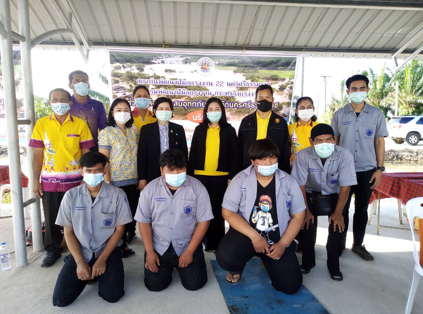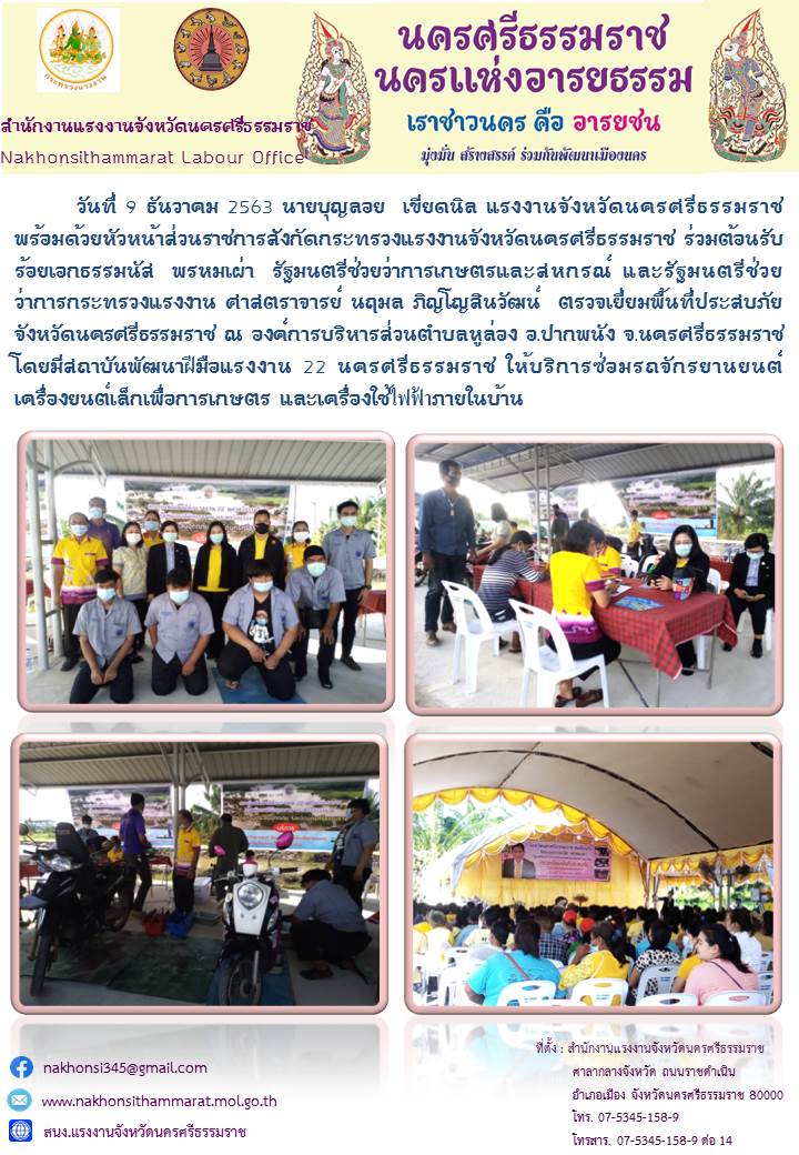 วันที่ 9 ธันวาคม 2563 นายบุญลอย เขียดนิล แรงงานจังหวัดนครศรีธรรมราช พร้อมด้วยหัวหน้าส่วนราชการสังกัดกระทรวงแรงงานจังหวัดนครศรีธรรมราช ร่วมต้อนรับร้อยเอกธรรมนัส พรหมเผ่า รัฐมนตรีช่วยว่าการเกษตรและสหกรณ์ และรัฐมนตรีช่วย ว่าการกระทรวงแรงงาน ศาสตราจารย์ นฤมล ภิญโญสินวัฒน์ ตรวจเยี่ยมพื้นที่ประสบภัย จังหวัดนครศรีธรรมราช ณ องค์การบริหารส่วนตำบลหูล่อง อ.ปากพนัง จ.นครศรีธรรมราช โดยมีสถาบันพัฒนาฝีมือแรงงาน 22 นครศรีธรรมราช ให้บริการซ่อมรถจักรยานยนต์ เครื่องยนต์เล็กเพื่อการเกษตร และเครื่องใช้ไฟฟ้าภายในบ้าน