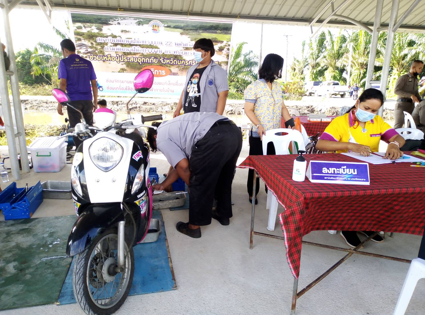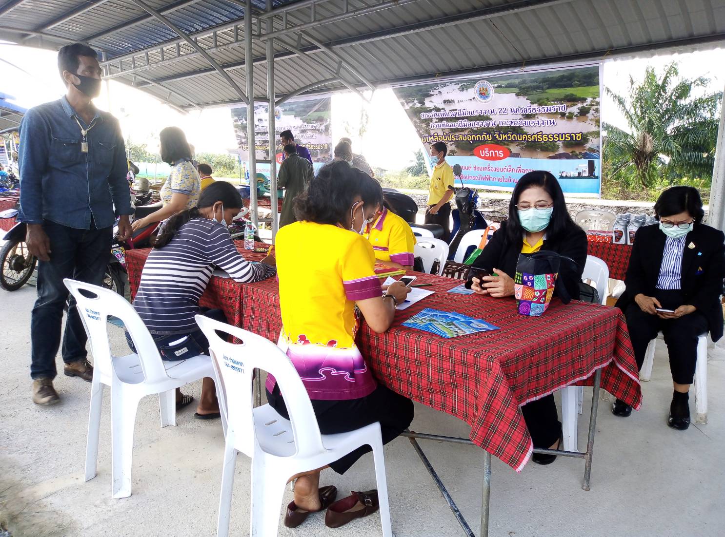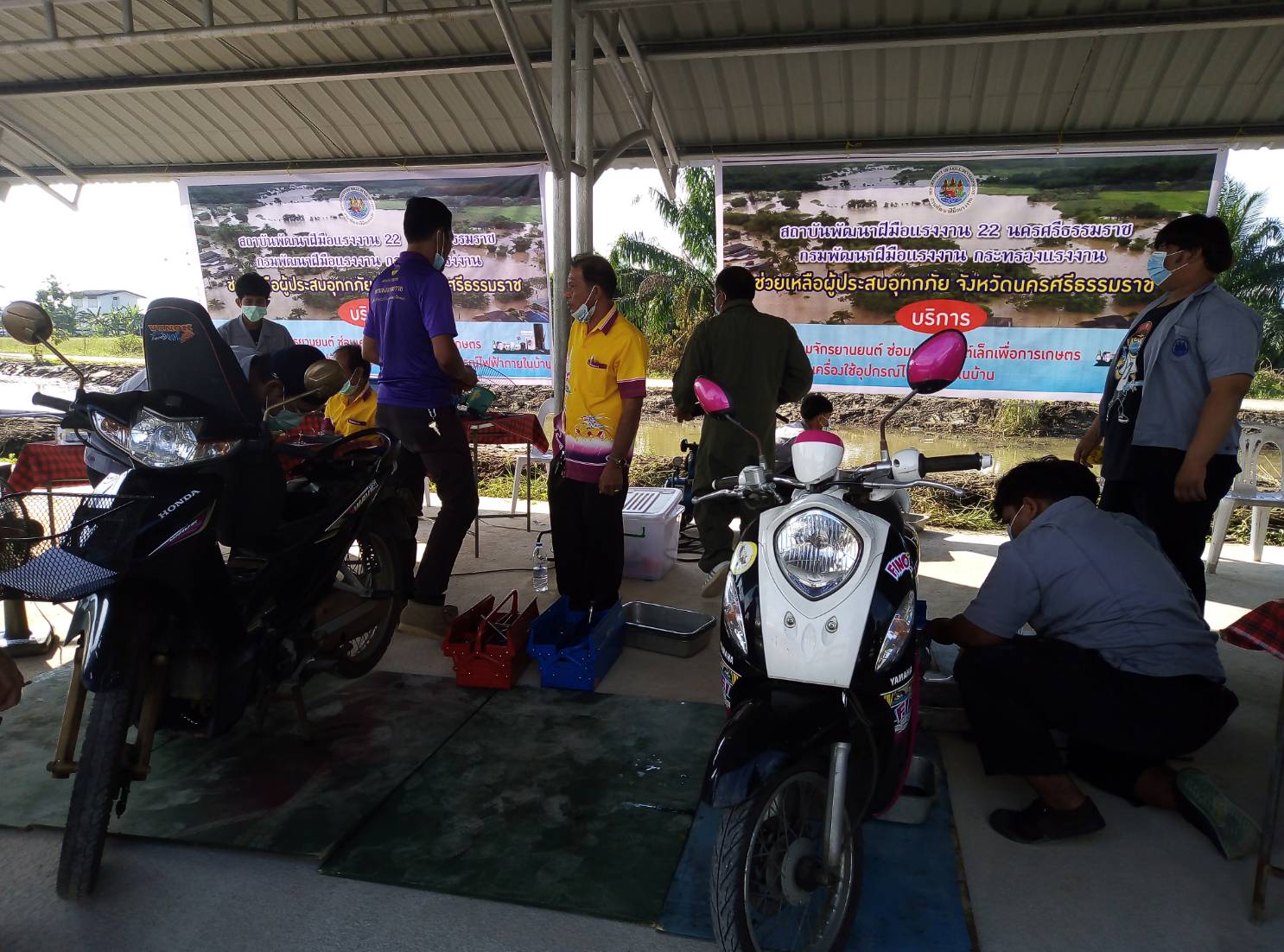วันที่ 9 ธันวาคม 2563 นายบุญลอย เขียดนิล แรงงานจังหวัดนครศรีธรรมราช พร้อมด้วยหัวหน้าส่วนราชการสังกัดกระทรวงแรงงานจังหวัดนครศรีธรรมราช ร่วมต้อนรับร้อยเอกธรรมนัส พรหมเผ่า รัฐมนตรีช่วยว่าการเกษตรและสหกรณ์ และรัฐมนตรีช่วย ว่าการกระทรวงแรงงาน ศาสตราจารย์ นฤมล ภิญโญสินวัฒน์ ตรวจเยี่ยมพื้นที่ประสบภัย จังหวัดนครศรีธรรมราช ณ องค์การบริหารส่วนตำบลหูล่อง อ.ปากพนัง จ.นครศรีธรรมราช โดยมีสถาบันพัฒนาฝีมือแรงงาน 22 นครศรีธรรมราช ให้บริการซ่อมรถจักรยานยนต์ เครื่องยนต์เล็กเพื่อการเกษตร และเครื่องใช้ไฟฟ้าภายในบ้าน