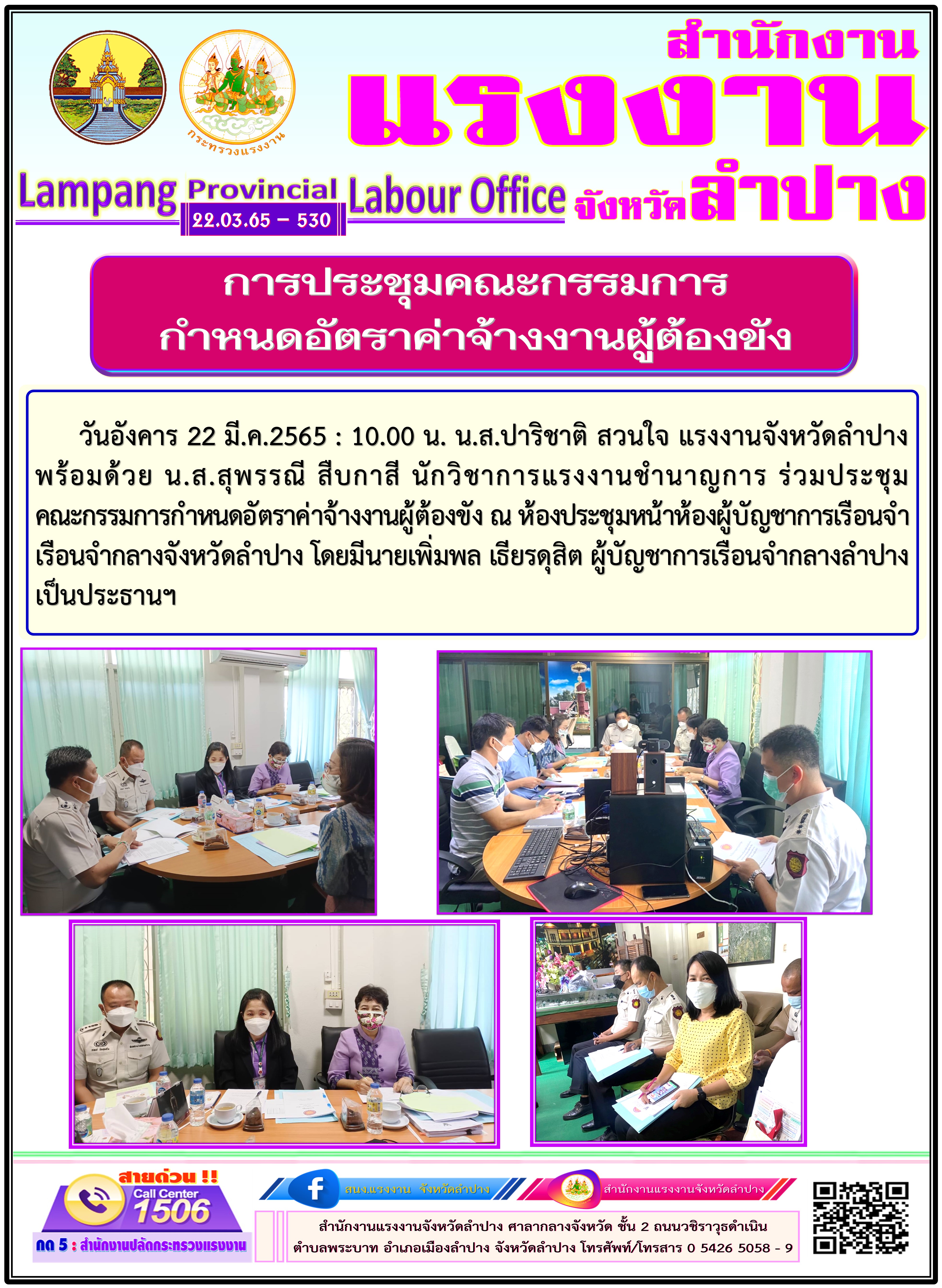 วันอังคาร 22 มี.ค.2565 เวลา 10.00 น. น.ส.ปาริชาติ สวนใจ แรงงานจังหวัดลำปางพร้อมด้วย น.ส.สุพรรณี สืบกาสี นักวิชาการแรงงานชำนาญการ ร่วมประชุมคณะกรรมการกำหนดอัตราค่าจ้างงานผู้ต้องขัง ณ ห้องประชุมหน้าห้องผู้บัญชาการเรือนจำ เรือนจำกลางจังหวัดลำปาง โดยมีนายเพิ่มพล เธียรดุสิต ผู้บัญชาการเรือนจำกลางลำปาง เป็นประธานฯ