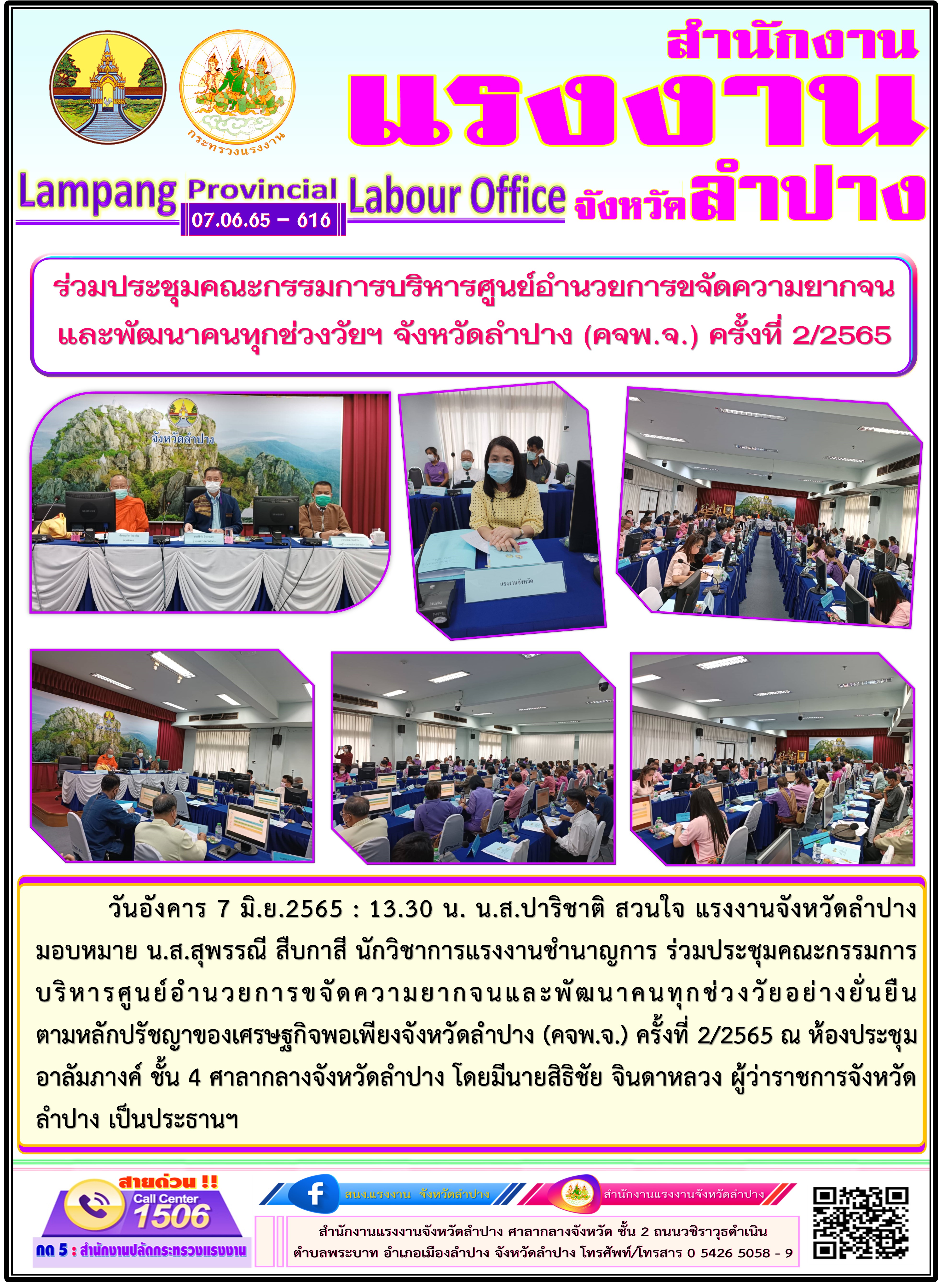 วันอังคาร 7 มิ.ย.2565 : 13.30 น. น.ส.ปาริชาติ สวนใจ แรงงานจังหวัดลำปาง มอบหมาย น.ส.สุพรรณี สืบกาสี นักวิชาการแรงงานชำนาญการ ร่วมประชุมคณะกรรมการบริหารศูนย์อำนวยการขจัดความยากจนและพัฒนาคนทุกช่วงวัยอย่างยั่นยืนตามหลักปรัชญาของเศรษฐกิจพอเพียงจังหวัดลำปาง (คจพ.จ.) ครั้งที่ 2/2565 ณ ห้องประชุม อาลัมภางค์ ชั้น 4 ศาลากลางจังหวัดลำปาง โดยมีนายสิธิชัย จินดาหลวง ผู้ว่าราชการจังหวัดลำปาง เป็นประธานฯ