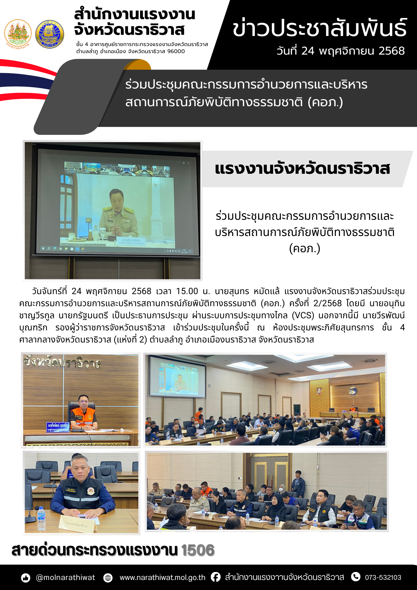วันจันทร์ที่ 24 พฤศจิกายน 2568 เวลา 15.00 น. นายสุนทร หมัดแล้ แรงงานจังหวัดนราธิวาสร่วมประชุม คณะกรรมการอำนวยการและบริหารสถานการณ์ภัยพิบัติทางธรรมชาติ (คอภ.) ครั้งที่ 2/2568 โดยมี นายอนุทิน ชาญวีรกูล นายกรัฐมนตรี เป็นประธานการประชุม ผ่านระบบการประชุมทางไกล (VCS) นอกจากนี้มี นายวีรพัฒน์ บุณฑริก รองผู้ว่าราชการจังหวัดนราธิวาส เข้าร่วมประชุมในครั้งนี้ ณ ห้องประชุมพระภิศัยสุนทรการ ชั้น 4 ศาลากลางจังหวัดนราธิวาส (แห่งที่ 2) ตำบลลำภู อำเภอเมืองนราธิวาส จังหวัดนราธิวาส