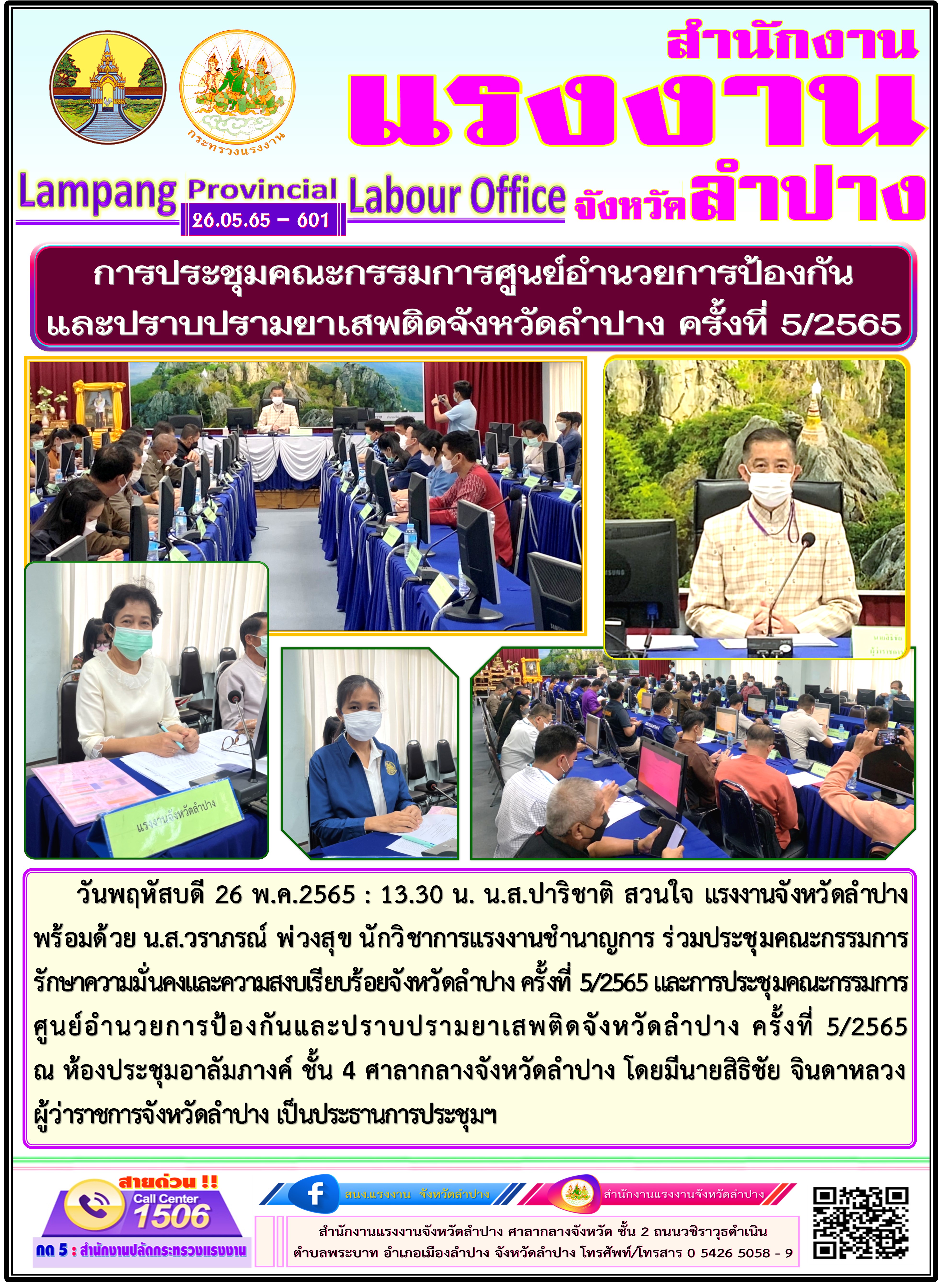 วันพฤหัสบดี 26 พ.ค.2565 : 13.30 น. น.ส.ปาริชาติ สวนใจ แรงงานจังหวัดลำปาง พร้อมด้วย น.ส.วราภรณ์ พ่วงสุข นักวิชาการแรงงานชำนาญการ ร่วมประชุมคณะกรรมการ รักษาความมั่นคงและความสงบเรียบร้อยจังหวัดลำปาง ครั้งที่ 5/2565 และการประชุมคณะกรรมการ ศูนย์อำนวยการป้องกันและปราบปรามยาเสพติดจังหวัดลำปาง ครั้งที่ 5/2565 ณ ห้องประชุมอาลัมภางค์ ชั้น 4 ศาลากลางจังหวัดลำปาง โดยมีนายสิธิชัย จินดาหลวง ผู้ว่าราชการจังหวัดลำปาง เป็นประธานการประชุมฯ