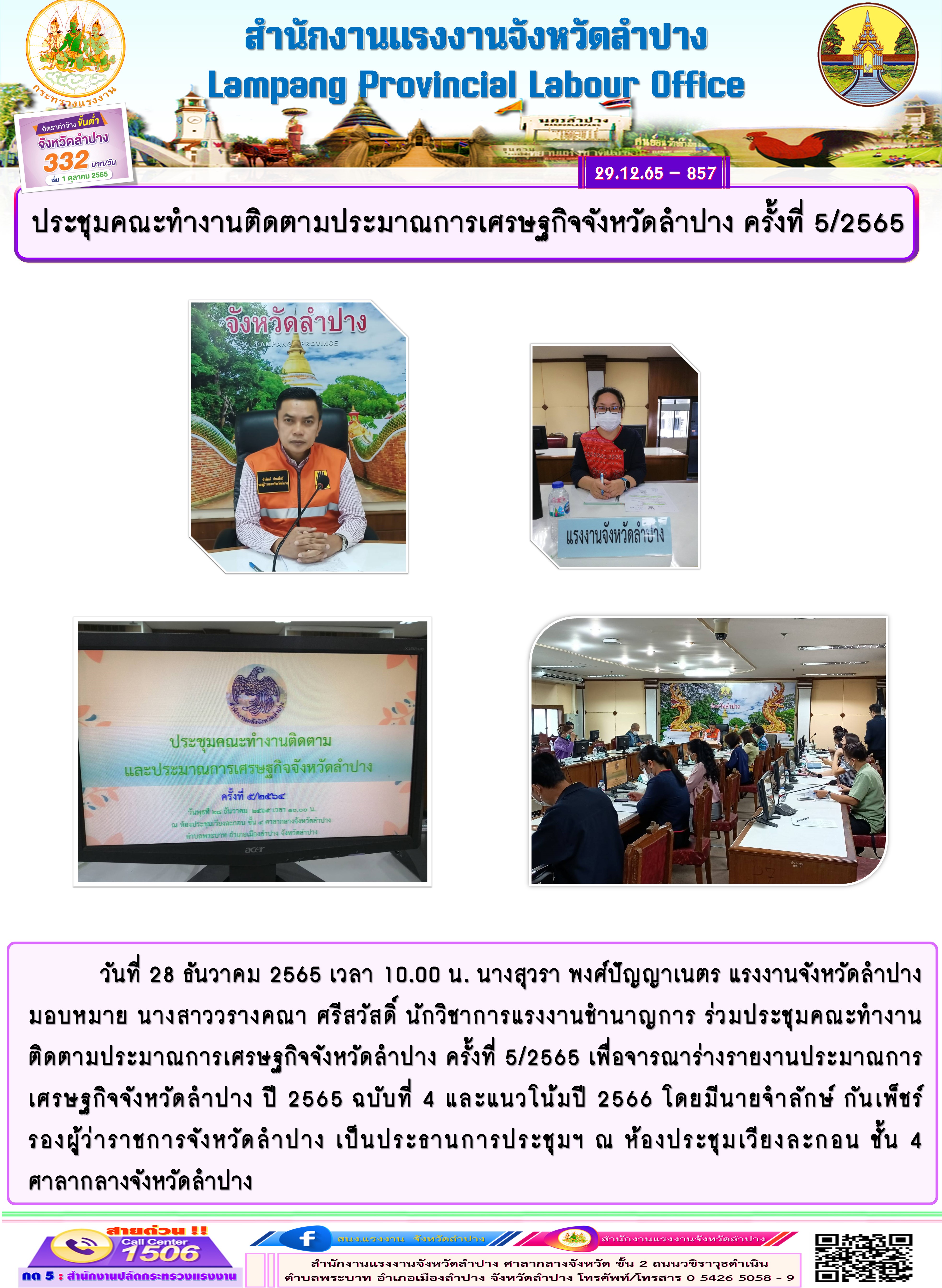วันที่ 28 ธันวาคม 2565 เวลา 10.00 น. นางสุวรา พงศ์ปัญญาเนตร แรงงานจังหวัดลำปาง มอบหมาย นางสาววรางคณา ศรีสวัสดิ์ นักวิชาการแรงงานชำนาญการ ร่วมประชุมคณะทำงาน ติดตามประมาณการเศรษฐกิจจังหวัดลำปาง ครั้งที่ 5/2565 เพื่อจารณาร่างรายงานประมาณการเศรษฐกิจจังหวัดลำปาง ปี 2565 ฉบับที่ 4 และแนวโน้มปี 2566 โดยมีนายจำลักษ์ กันเพ็ชร์ รองผู้ว่าราชการจังหวัดลำปาง เป็นประธานการประชุมฯ ณ ห้องประชุมเวียงละกอน ชั้น 4 ศาลากลางจังหวัดลำปาง