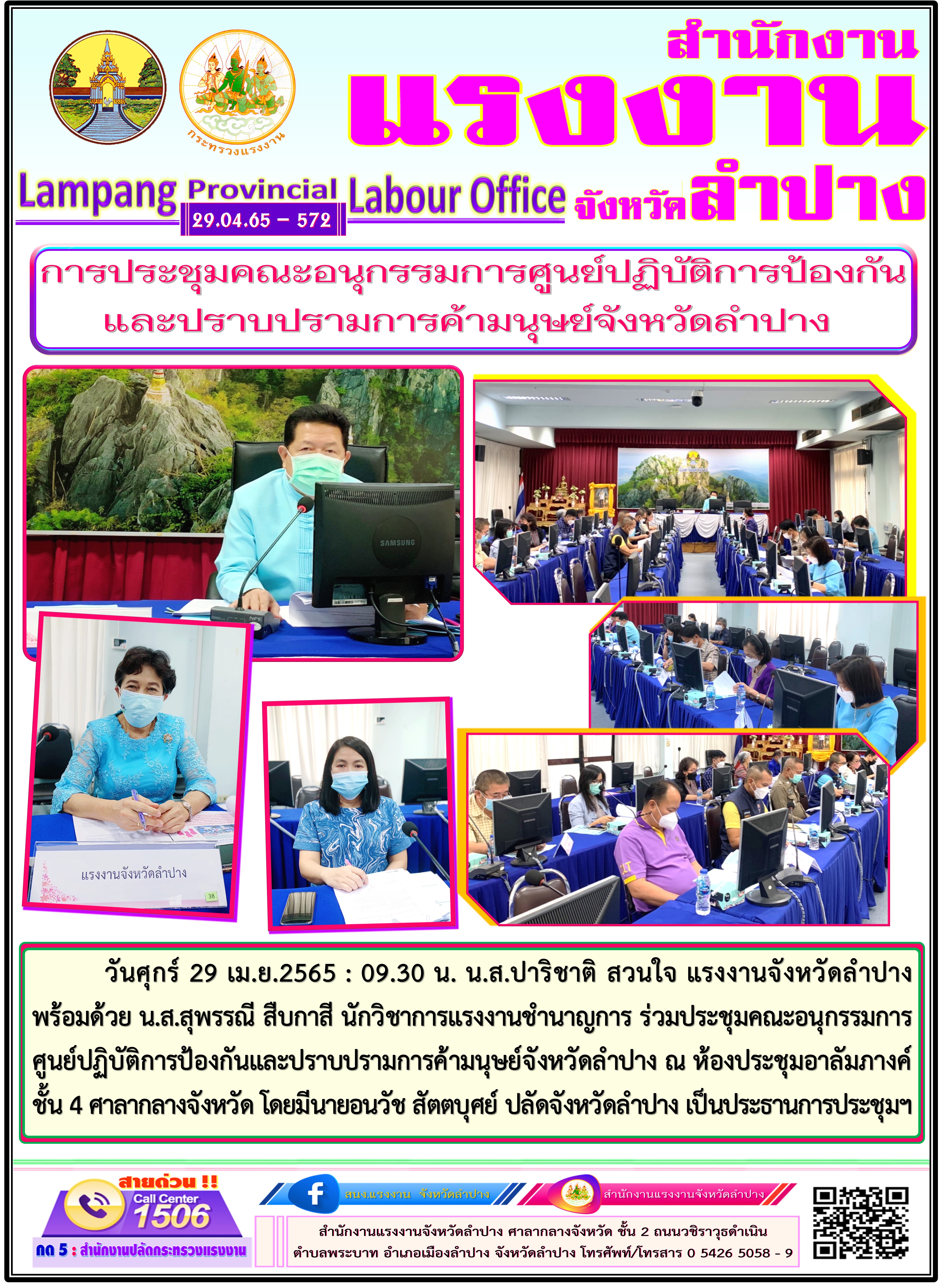 วันศุกร์ 29 เม.ย.2565 : 09.30 น. น.ส.ปาริชาติ สวนใจ แรงงานจังหวัดลำปาง พร้อมด้วย น.ส.สุพรรณี สืบกาสี นักวิชาการแรงงานชำนาญการ ร่วมประชุมคณะอนุกรรมการศูนย์ปฏิบัติการป้องกันและปราบปรามการค้ามนุษย์จังหวัดลำปาง ณ ห้องประชุมอาลัมภางค์ ชั้น 4 ศาลากลางจังหวัด โดยมีนายอนวัช สัตตบุศย์ ปลัดจังหวัดลำปาง เป็นประธานการประชุมฯ
