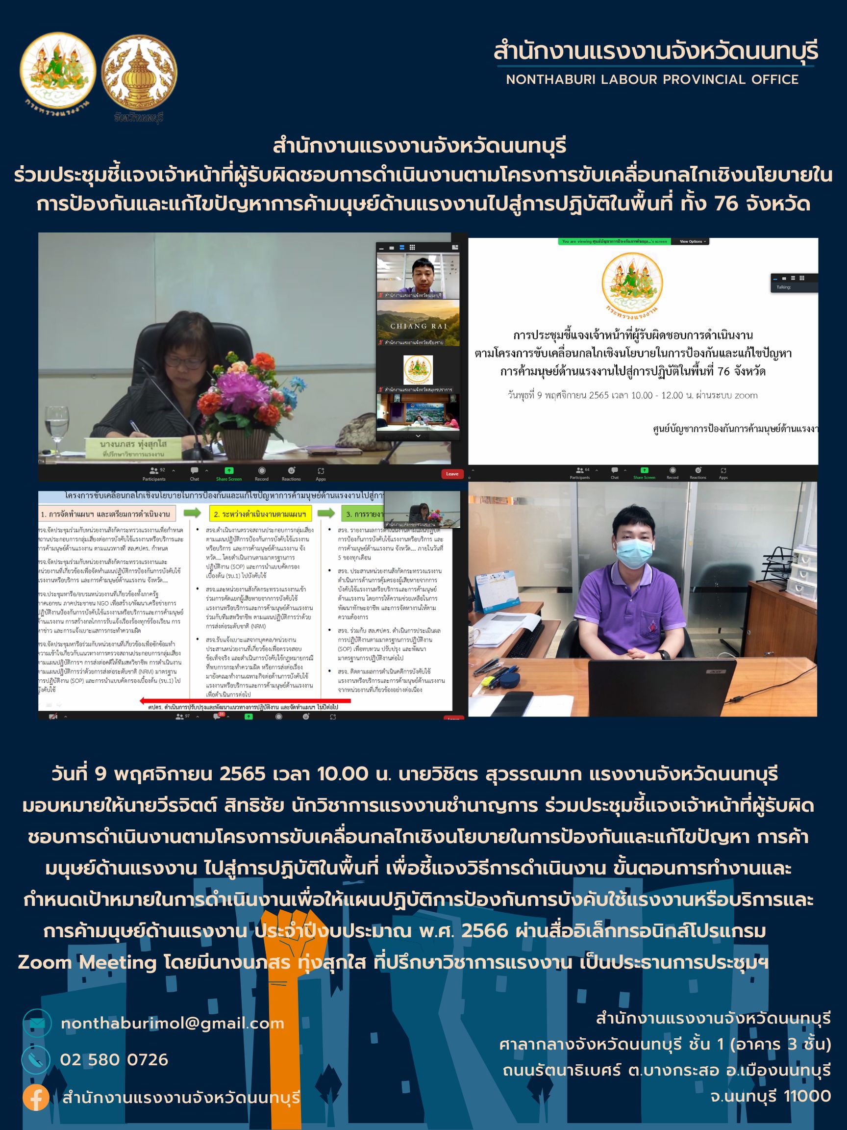 วันที่ 9 พฤศจิกายน 2565 เวลา 10.00 น. นายวิชิตร สุวรรณมาก แรงงานจังหวัดนนทบุรี มอบหมายให้นายวีรจิตต์ สิทธิชัย นักวิชาการแรงงานชำนาญการ ร่วมประชุมชี้แจงเจ้าหน้าที่ผู้รับผิดชอบการดำเนินงานตามโครงการขับเคลื่อนกลไกเชิงนโยบายในการป้องกันและแก้ไขปัญหา การค้ามนุษย์ด้านแรงงาน ไปสู่การปฏิบัติในพื้นที่ เพื่อชี้แจงวิธีการดำเนินงาน ขั้นตอนการทำงานและกำหนดเป้าหมายในการดำเนินงานเพื่อให้แผนปฏิบัติการป้องกันการบังคับใช้แรงงานหรือบริการและการค้ามนุษย์ด้านแรงงาน ประจำปีงบประมาณ พ.ศ. 2566 ผ่านสื่ออิเล็กทรอนิกส์โปรแกรม Zoom Meeting โดยมีนางนภสร ทุ่งสุกใส ที่ปรึกษาวิชาการแรงงาน เป็นประธานการประชุมฯ
