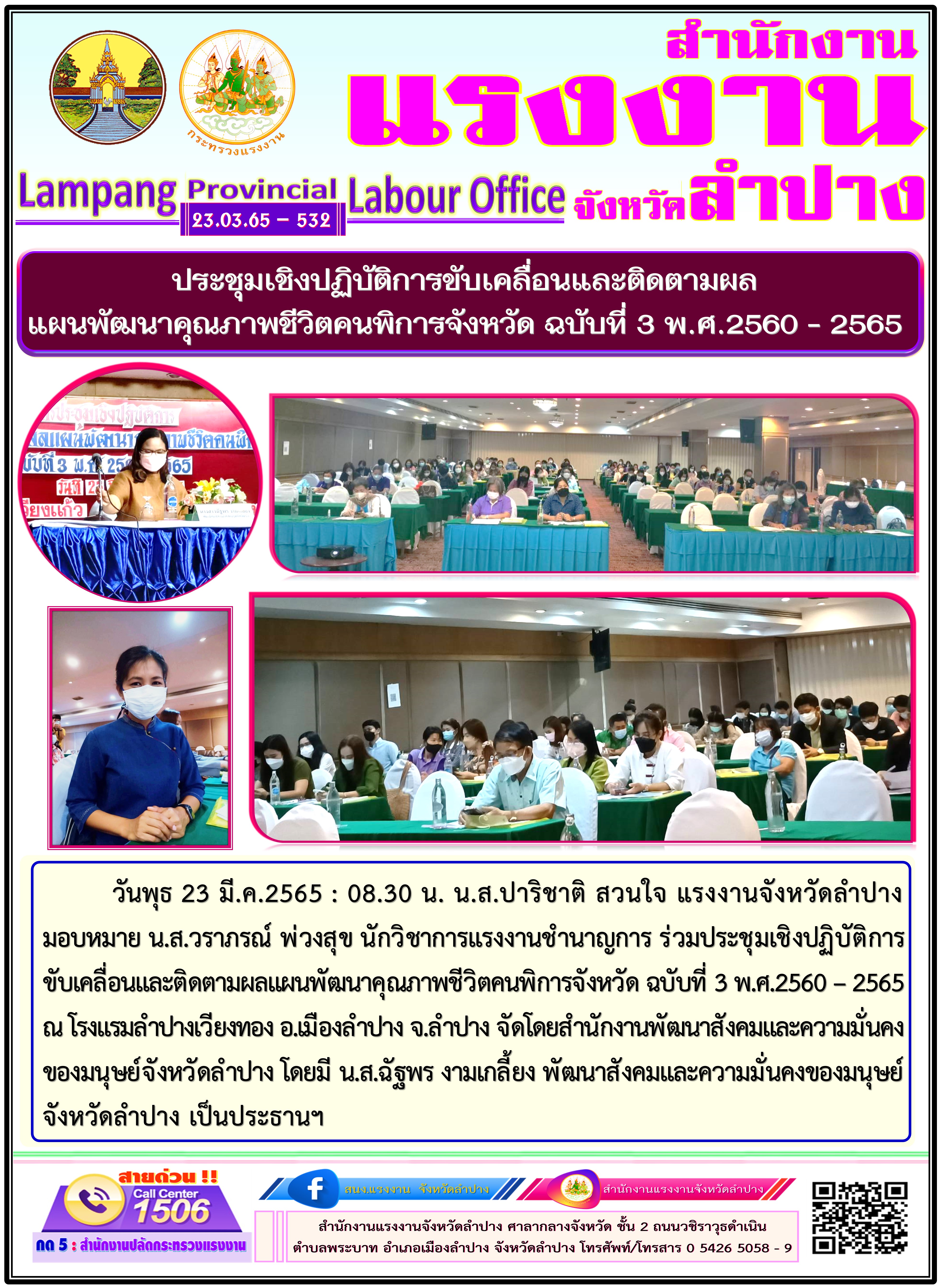 วันพุธ 23 มี.ค.2565 เวลา 08.30 น. น.ส.ปาริชาติ สวนใจ แรงงานจังหวัดลำปาง มอบหมาย น.ส.วราภรณ์ พ่วงสุข นักวิชาการแรงงานชำนาญการ ร่วมประชุมเชิงปฏิบัติการขับเคลื่อนและติดตามผลแผนพัฒนาคุณภาพชีวิตคนพิการจังหวัด ฉบับที่ 3 พ.ศ.2560 – 2565 ณ โรงแรมลำปางเวียงทอง อ.เมืองลำปาง จ.ลำปาง จัดโดยสำนักงานพัฒนาสังคมและความมั่นคงของมนุษย์จังหวัดลำปาง โดยมี น.ส.ฉัฐพร งามเกลี้ยง พัฒนาสังคมและความมั่นคงของมนุษย์จังหวัดลำปาง เป็นประธานฯ
