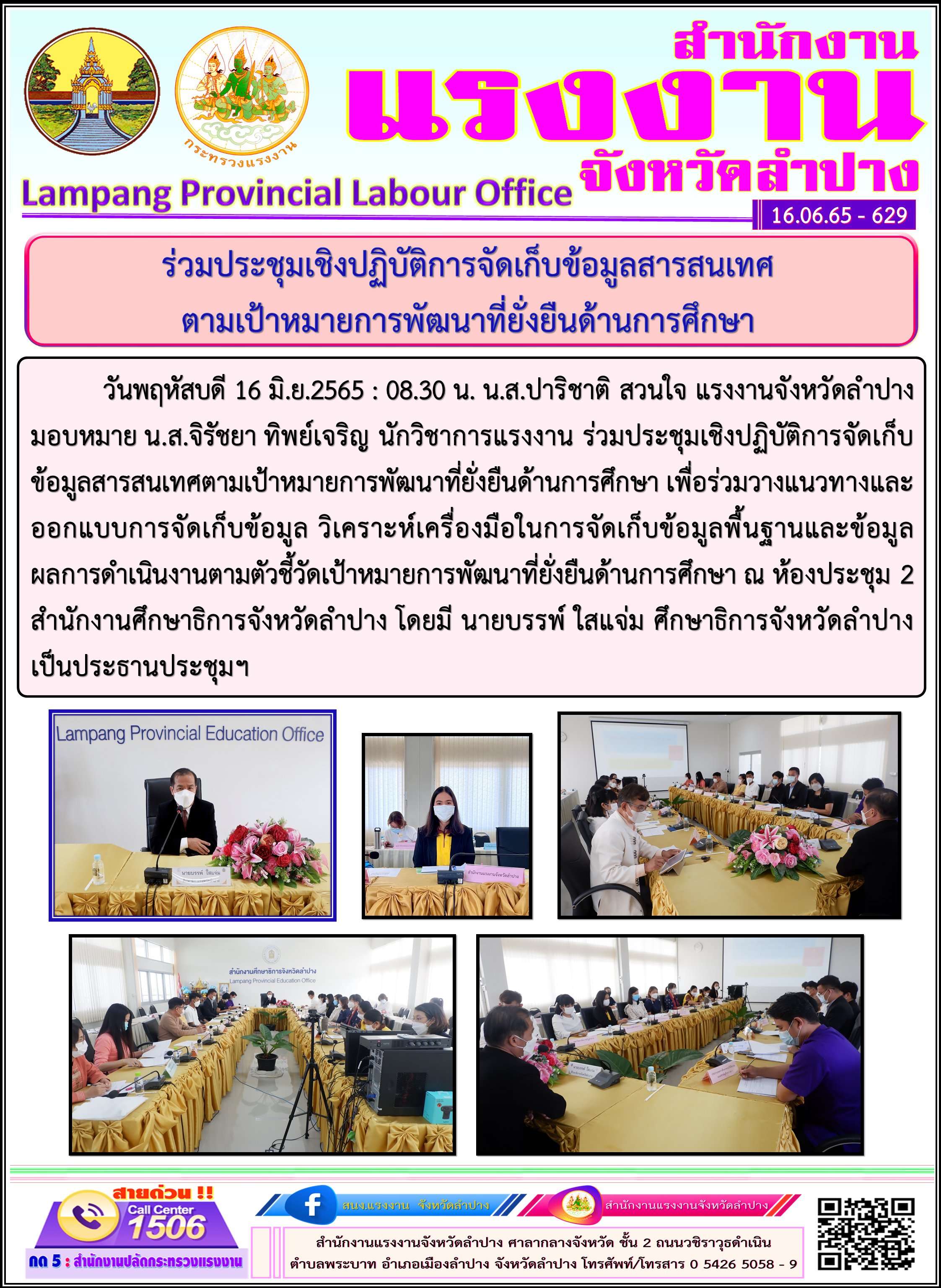 วันพฤหัสบดี 16 มิ.ย.2565 : 08.30 น. น.ส.ปาริชาติ สวนใจ แรงงานจังหวัดลำปาง มอบหมาย น.ส.จิรัชยา ทิพย์เจริญ นักวิชาการแรงงาน ร่วมประชุมเชิงปฏิบัติการจัดเก็บข้อมูลสารสนเทศตามเป้าหมายการพัฒนาที่ยั่งยืนด้านการศึกษา เพื่อร่วมวางแนวทางและออกแบบการจัดเก็บข้อมูล วิเคราะห์เครื่องมือในการจัดเก็บข้อมูลพื้นฐานและข้อมูล ผลการดำเนินงานตามตัวชี้วัดเป้าหมายการพัฒนาที่ยั่งยืนด้านการศึกษา ณ ห้องประชุม 2 สำนักงานศึกษาธิการจังหวัดลำปาง โดยมี นายบรรพ์ ใสแจ่ม ศึกษาธิการจังหวัดลำปาง เป็นประธานประชุมฯ