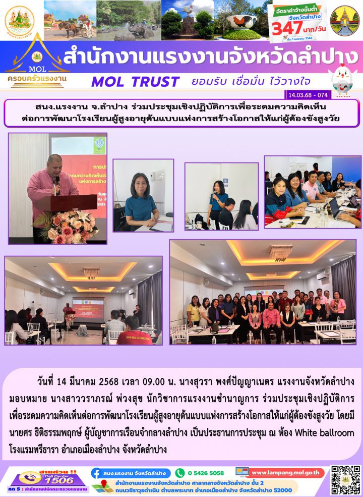 วันที่ 14 มีนาคม 2568 เวลา 09.00 น. นางสุวรา พงศ์ปัญญาเนตร แรงงานจังหวัดลำปาง มอบหมาย นางสาววราภรณ์ พ่วงสุข นักวิชาการแรงงานชำนาญการ ร่วมประชุมเชิงปฏิบัติการเพื่อระดมความคิดเห็นต่อการพัฒนาโรงเรียนผู้สูงอายุต้นแบบแห่งการสร้างโอกาสให้แก่ผู้ต้องขังสูงวัย โดยมีนายศร ธิติธรรมพฤกษ์ ผู้บัญชาการเรือนจำกลางลำปาง เป็นประธานการประชุม ณ ห้อง White ballroom โรงแรมทรีธารา อำเภอเมืองลำปาง จังหวัดลำปาง