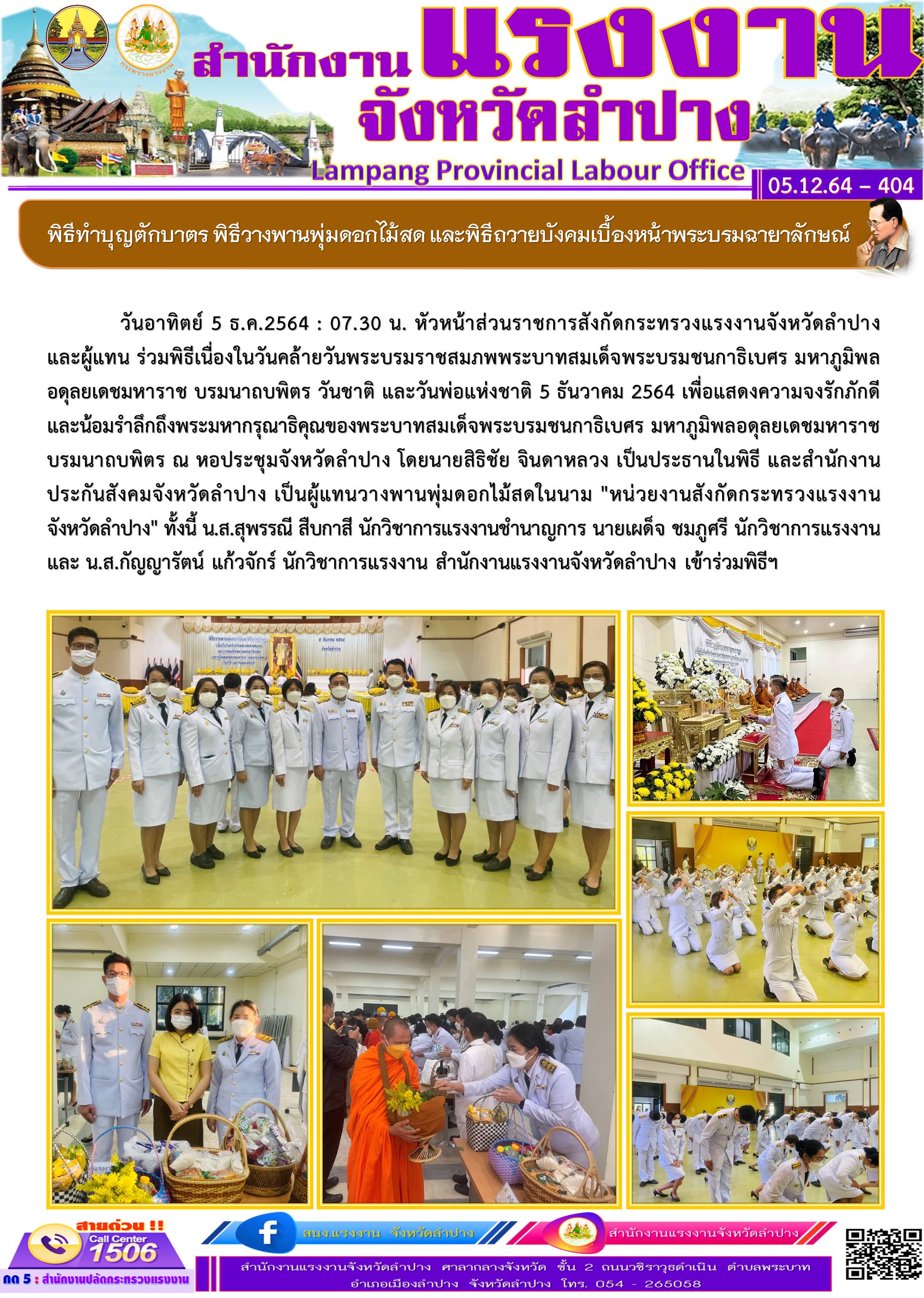 สรจ.ลำปาง ร่วมพิธีทำบุญตักบาตร พิธีวางพานพุ่มดอกไม้สด และพิธีถวายบังคมเบื้องหน้าพระบรมฉายาลักษณ์