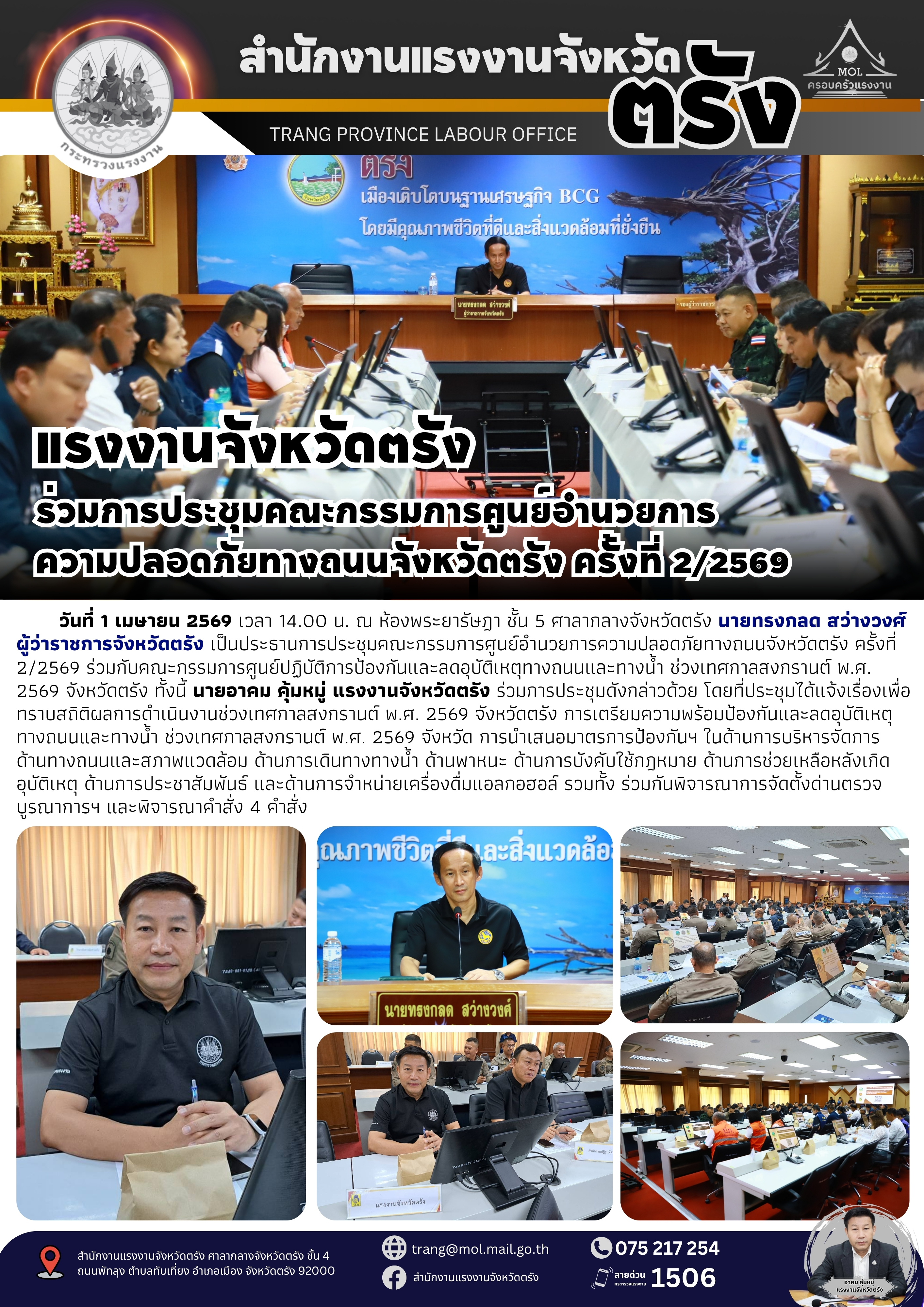 แรงงานจังหวัดตรัง ร่วมการประชุมคณะกรรมการศูนย์อำนวยการ ความปลอดภัยทางถนนจังหวัดตรัง ครั้งที่ 2/2569