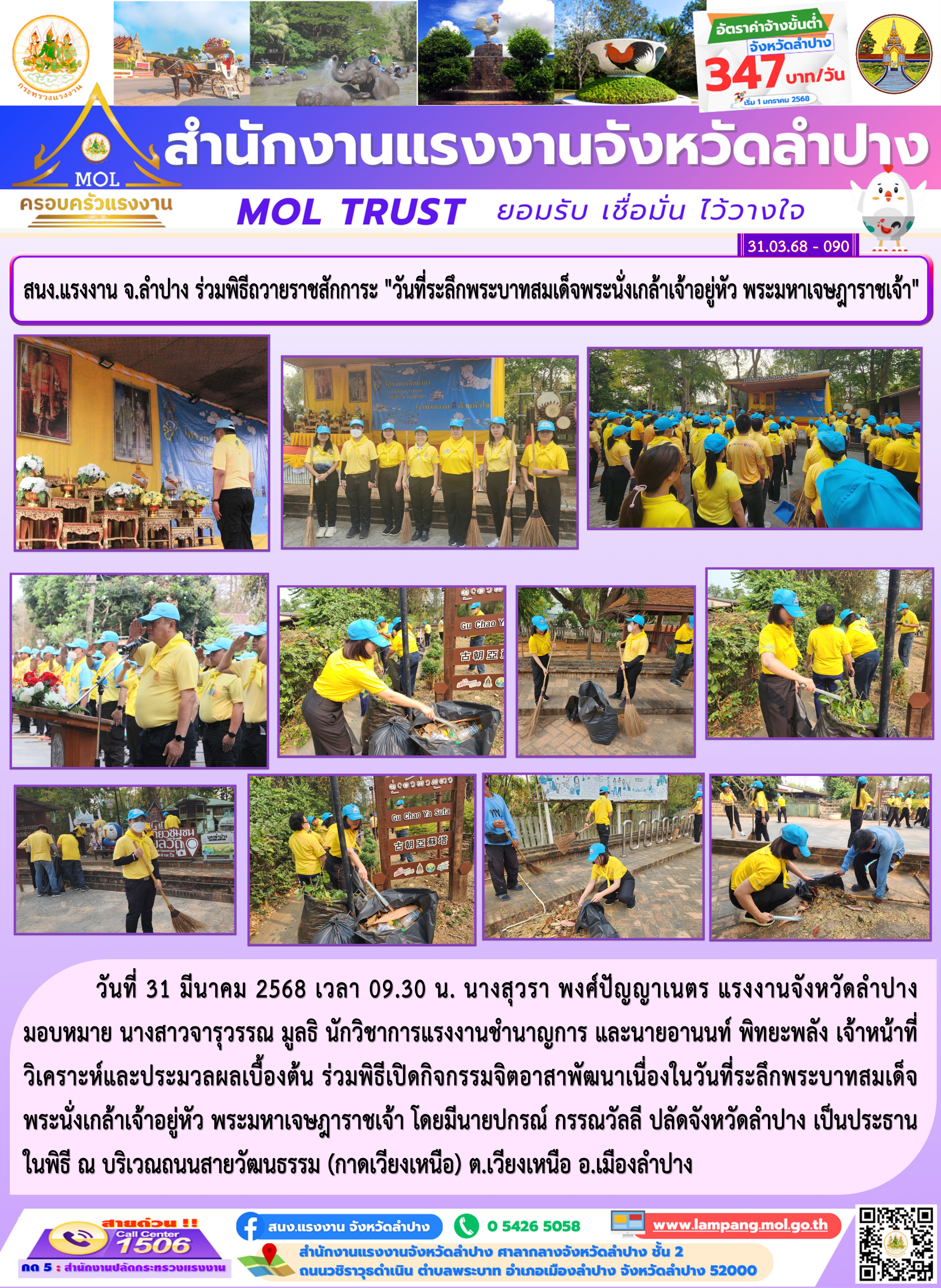 วันที่ 31 มีนาคม 2568 เวลา 09.30 น. นางสุวรา พงศ์ปัญญาเนตร แรงงานจังหวัดลำปาง มอบหมาย นางสาวจารุวรรณ มูลธิ นักวิชาการแรงงานชำนาญการ และนายอานนท์ พิทยะพลัง เจ้าหน้าที่วิเคราะห์และประมวลผลเบื้องต้น ร่วมพิธีเปิดกิจกรรมจิตอาสาพัฒนาเนื่องในวันที่ระลึกพระบาทสมเด็จพระนั่งเกล้าเจ้าอยู่หัว พระมหาเจษฎาราชเจ้า โดยมีนายปกรณ์ กรรณวัลลี ปลัดจังหวัดลำปาง เป็นประธานในพิธี ณ บริเวณถนนสายวัฒนธรรม (กาดเวียงเหนือ) ต.เวียงเหนือ อ.เมืองลำปาง