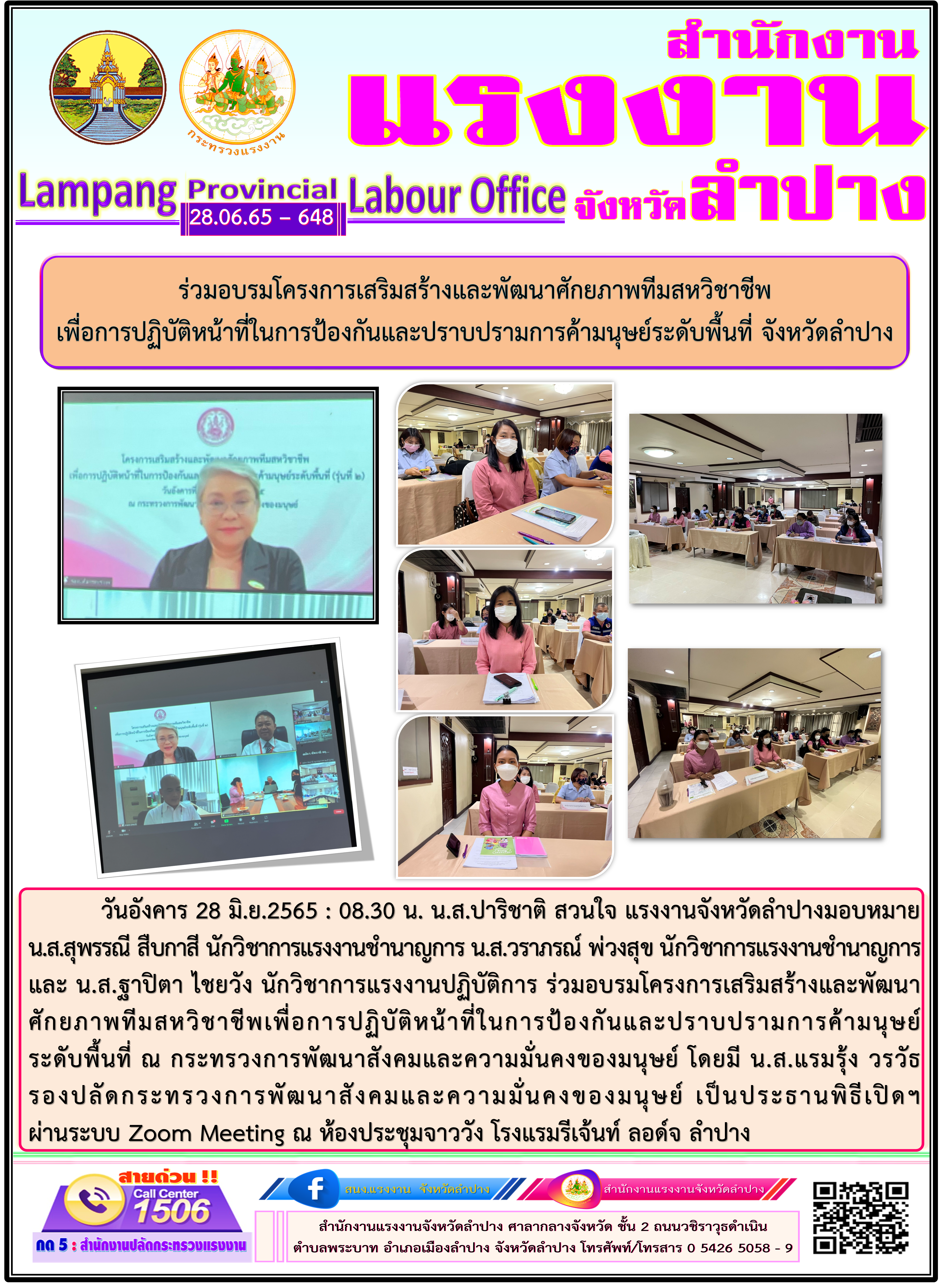 วันอังคาร 28 มิ.ย.2565 : 08.30 น. น.ส.ปาริชาติ สวนใจ แรงงานจังหวัดลำปางมอบหมาย น.ส.สุพรรณี สืบกาสี นักวิชาการแรงงานชำนาญการ น.ส.วราภรณ์ พ่วงสุข นักวิชาการแรงงานชำนาญการและ น.ส.ฐาปิตา ไชยวัง นักวิชาการแรงงานปฏิบัติการ ร่วมอบรมโครงการเสริมสร้างและพัฒนาศักยภาพทีมสหวิชาชีพเพื่อการปฏิบัติหน้าที่ในการป้องกันและปราบปรามการค้ามนุษย์ ระดับพื้นที่ ณ กระทรวงการพัฒนาสังคมและความมั่นคงของมนุษย์ โดยมี น.ส.แรมรุ้ง วรวัธ รองปลัดกระทรวงการพัฒนาสังคมและความมั่นคงของมนุษย์ เป็นประธานพิธีเปิดฯ ผ่านระบบ Zoom Meeting ณ ห้องประชุมจาววัง โรงแรมรีเจ้นท์ ลอด์จ ลำปาง