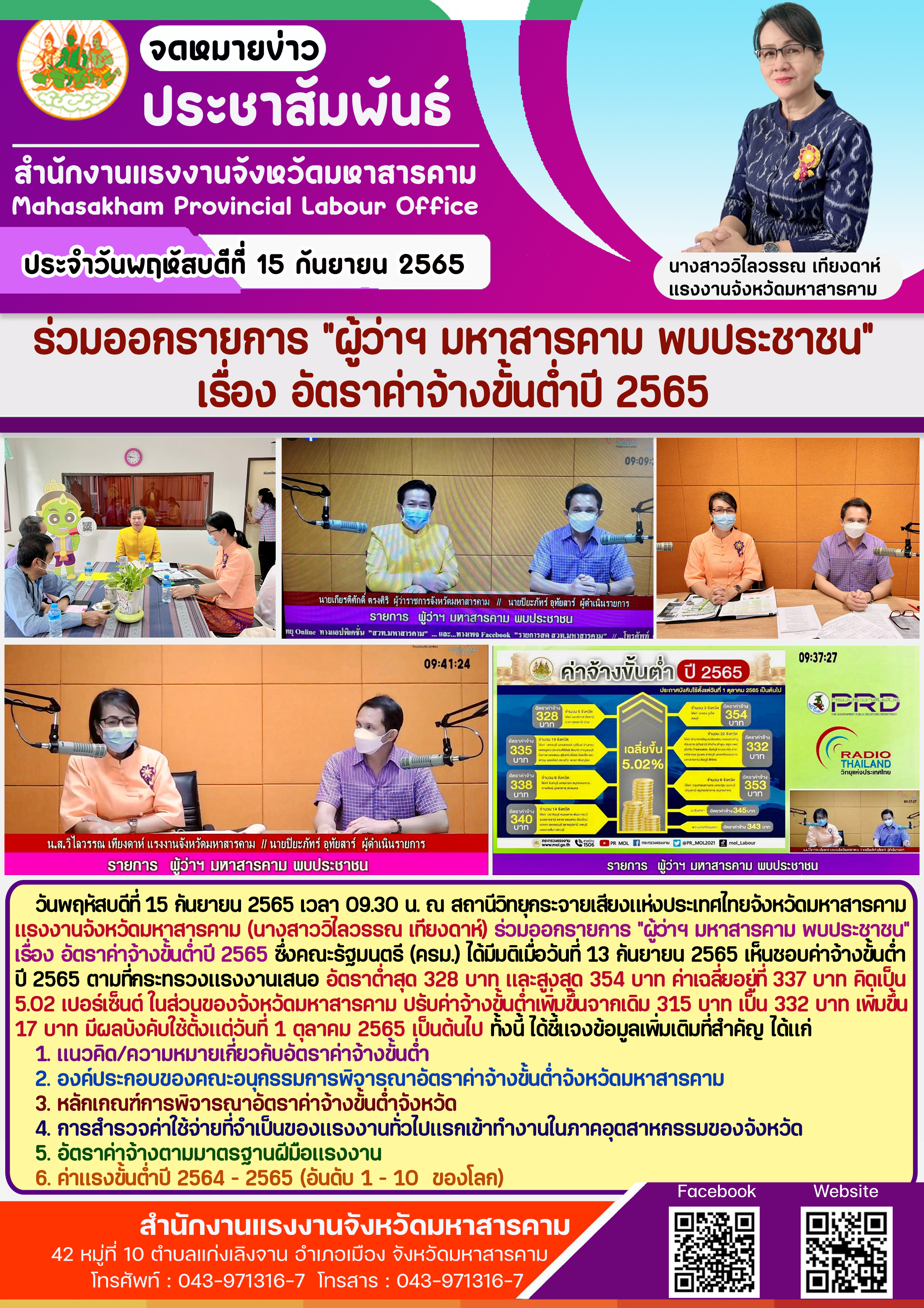 แรงงานจังหวัดมหาสารคาม (นางสาววิไลวรรณ เทียงดาห์) ร่วมออกรายการ “ผู้ว่าฯ มหาสารคาม พบประชาชน” เรื่อง อัตราค่าจ้างขั้นต่ำปี 2565 ซึ่งคณะรัฐมนตรี (ครม.) ได้มีมติเมื่อวันที่ 13 กันยายน 2565 เห็นชอบค่าจ้างขั้นต่ำ ปี 2565 ตามที่กระทรวงแรงงานเสนอ อัตราต่ำสุด 328 บาท และสูงสุด 354 บาท ค่าเฉลี่ยอยู่ที่ 337 บาท คิดเป็น 5.02 เปอร์เซ็นต์ ในส่วนของจังหวัดมหาสารคาม ปรับค่าจ้างขั้นต่ำเพิ่มขึ้นจากเดิม 315 บาท เป็น 332 บาท เพิ่มขึ้น 17 บาท มีผลบังคับใช้ตั้งแต่วันที่ 1 ตุลาคม 2565 เป็นต้นไปทั้งนี้ ได้ชี้แจงข้อมูลเพิ่มเติมที่สำคัญ ได้แก่