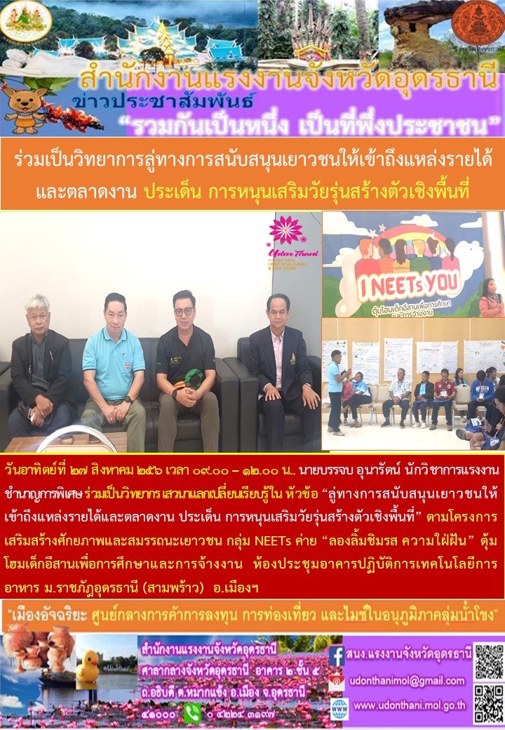 สรจ.อุดรธานี ร่วมเป็นวิทยาการลู่ทางการสนับสนุนเยาวชนให้เข้าถึงแหล่งรายได้และตลาดแรงงาน ประเด็น การหนุนเสริมวัยรุ่นสร้างตัวเชิงพื้นที่