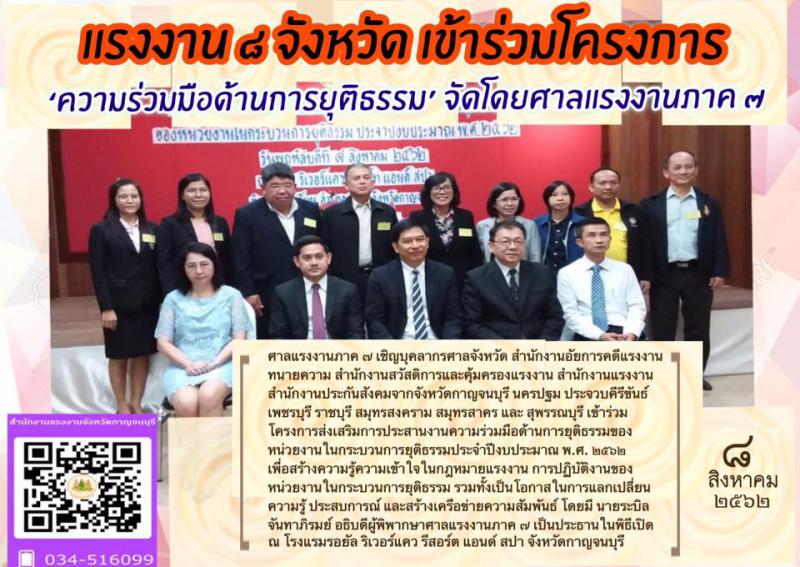 ศาลแรงงานภาค 7 เชิญบุคลากรศาลจังหวัด สำนักงานอัยการคดีแรงงาน ทนายความ สำนักงานสวัสดิการและคุ้มครองแรงงาน สำนักงานแรงงาน สำนักงานประกันสังคมจากจังหวัดกาญจนบุรี นครปฐม ประจวบคีรีขันธ์ เพชรบุรี ราชบุรี สมุทรสงคราม สมุทรสาคร และ สุพรรณบุรี เข้าร่วมโครงการส่งเสริมการประสานงานความร่วมมือด้านการยุติธรรมของหน่วยงานในกระบวนการยุติธรรมประจำปีงบประมาณ พ.ศ. 2562 เพื่อสร้างความรู้ความเข้าใจในกฎหมายแรงงาน การปฏิบัติงานของหน่วยงานในกระบวนการยุติธรรม รวมทั้งเป็นโอกาสในการแลกเปลี่ยนความรู้ ประสบการณ์ และสร้างเครือข่ายความสัมพันธ์ โดยมี นายระบิล จันทาภิรมย์ อธิบดีผู้พิพากษาศาล แรงงานภาค 7 เป็นประธานในพิธีเปิดณ โรงแรมรอยัล ริเวอร์แควรีสอร์ต แอนด์ สปา จังหวัดกาญจนบุรี โดยทั้งนี้ นางสุขุมาล ธนานันต์ แรงงานจังหวัดกาญจนบุรี พร้อมนายธนัท พุมมาเกิด นักวิชาการแรงงานชำนาญการ จากสำนักงานแรงงานจังหวัดกาญจนบุรี ได้เข้าร่วมโครงการดังกล่าว
