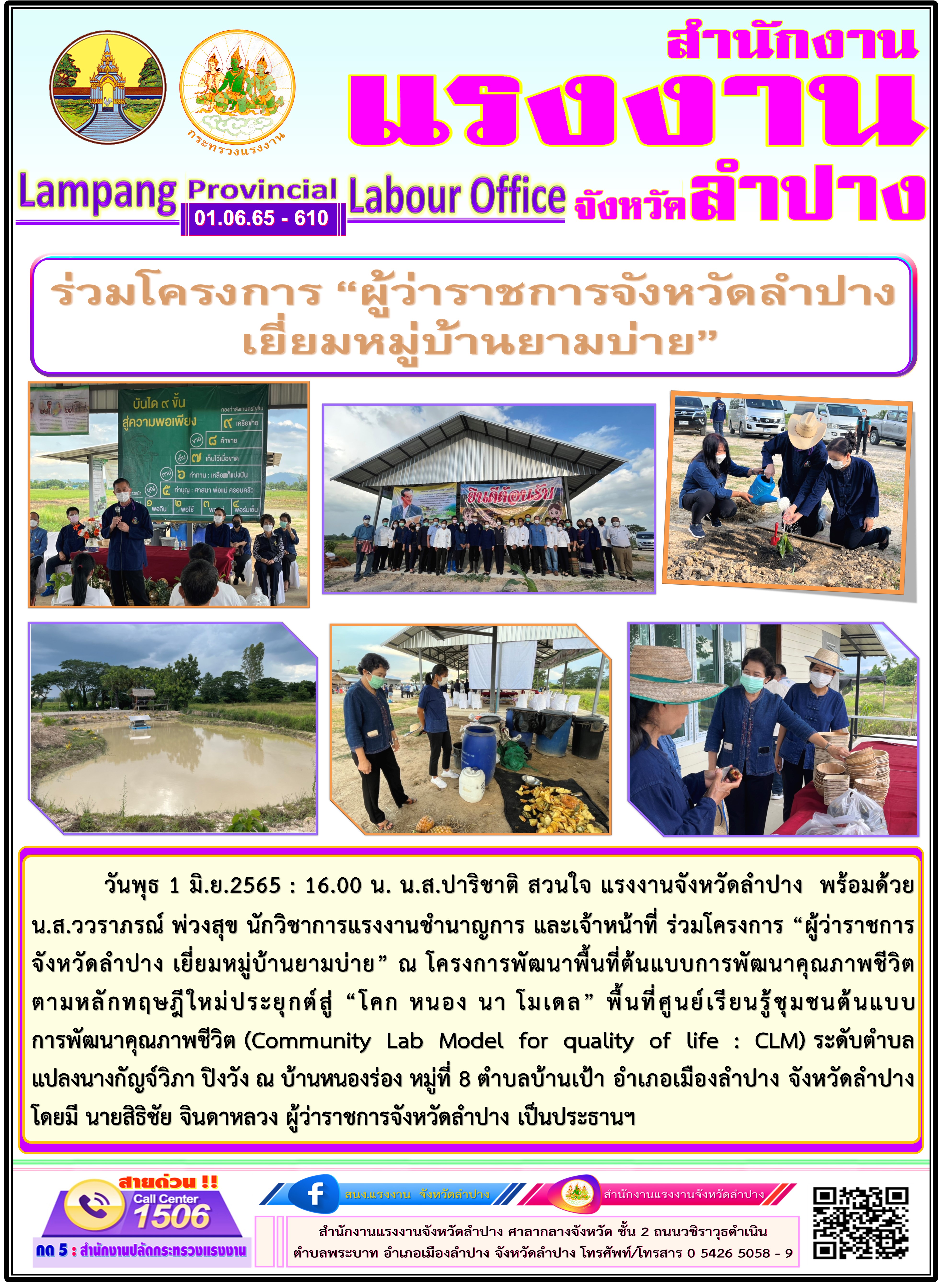 วันพุธ 1 มิ.ย.2565 : 16.00 น. น.ส.ปาริชาติ สวนใจ แรงงานจังหวัดลำปาง พร้อมด้วย น.ส.ววราภรณ์ พ่วงสุข นักวิชาการแรงงานชำนาญการ และเจ้าหน้าที่ ร่วมโครงการ “ผู้ว่าราชการจังหวัดลำปาง เยี่ยมหมู่บ้านยามบ่าย” ณ โครงการพัฒนาพื้นที่ต้นแบบการพัฒนาคุณภาพชีวิต ตามหลักทฤษฎีใหม่ประยุกต์สู่ “โคก หนอง นา โมเดล” พื้นที่ศูนย์เรียนรู้ชุมชนต้นแบบ การพัฒนาคุณภาพชีวิต (Community Lab Model for quality of life : CLM) ระดับตำบล แปลงนางกัญจ์วิภา ปิงวัง ณ บ้านหนองร่อง หมู่ที่ 8 ตำบลบ้านเป้า อำเภอเมืองลำปาง จังหวัดลำปาง โดยมี นายสิธิชัย จินดาหลวง ผู้ว่าราชการจังหวัดลำปาง เป็นประธานฯ