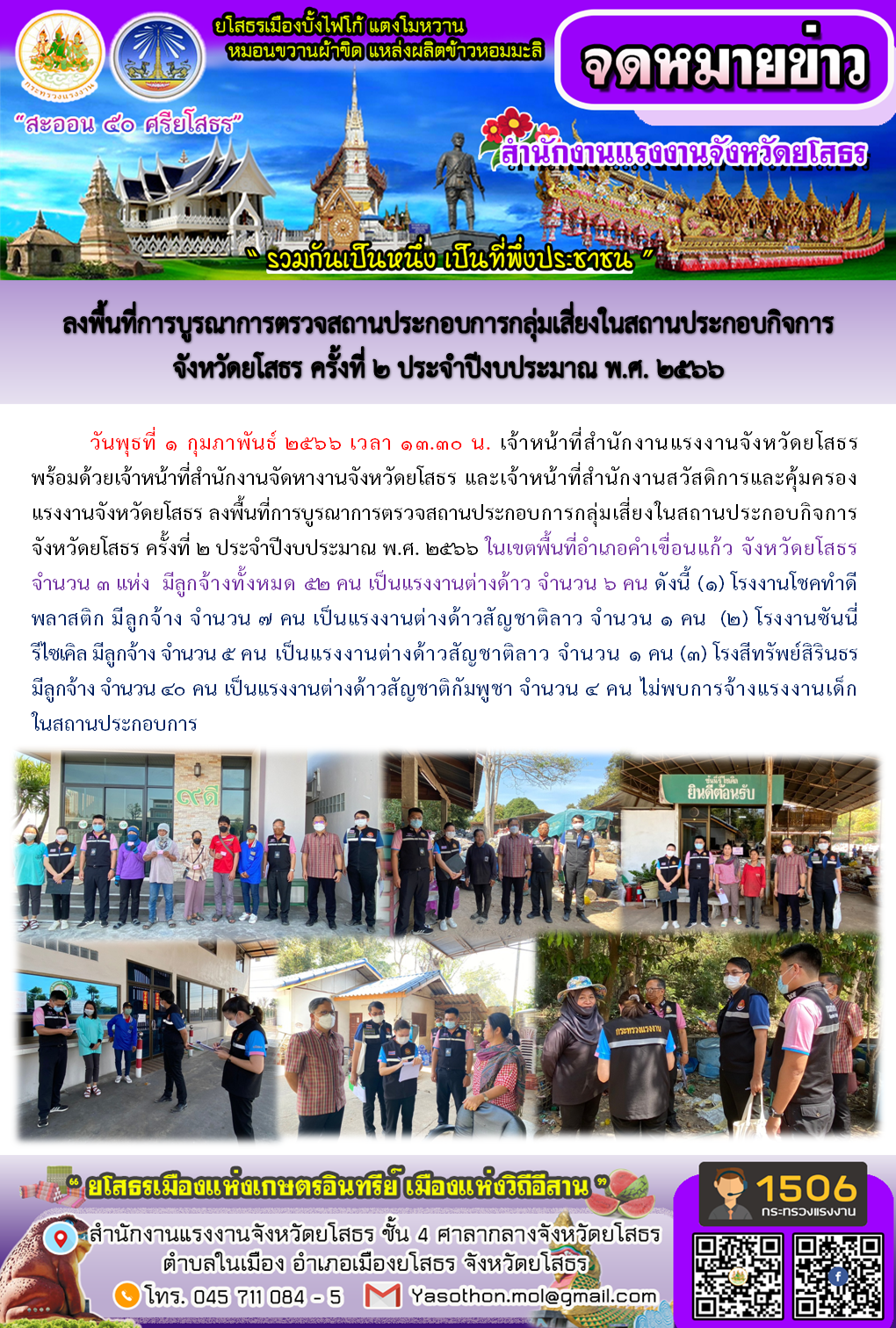 สรจ.ยโสธร ลงพื้นที่การบูรณาการตรวจสถานประกอบการกลุ่มเสี่ยงในสถานประกอบกิจการ จังหวัดยโสธร ครั้งที่ 2 ประจำปีงบประมาณ พ.ศ. 2566