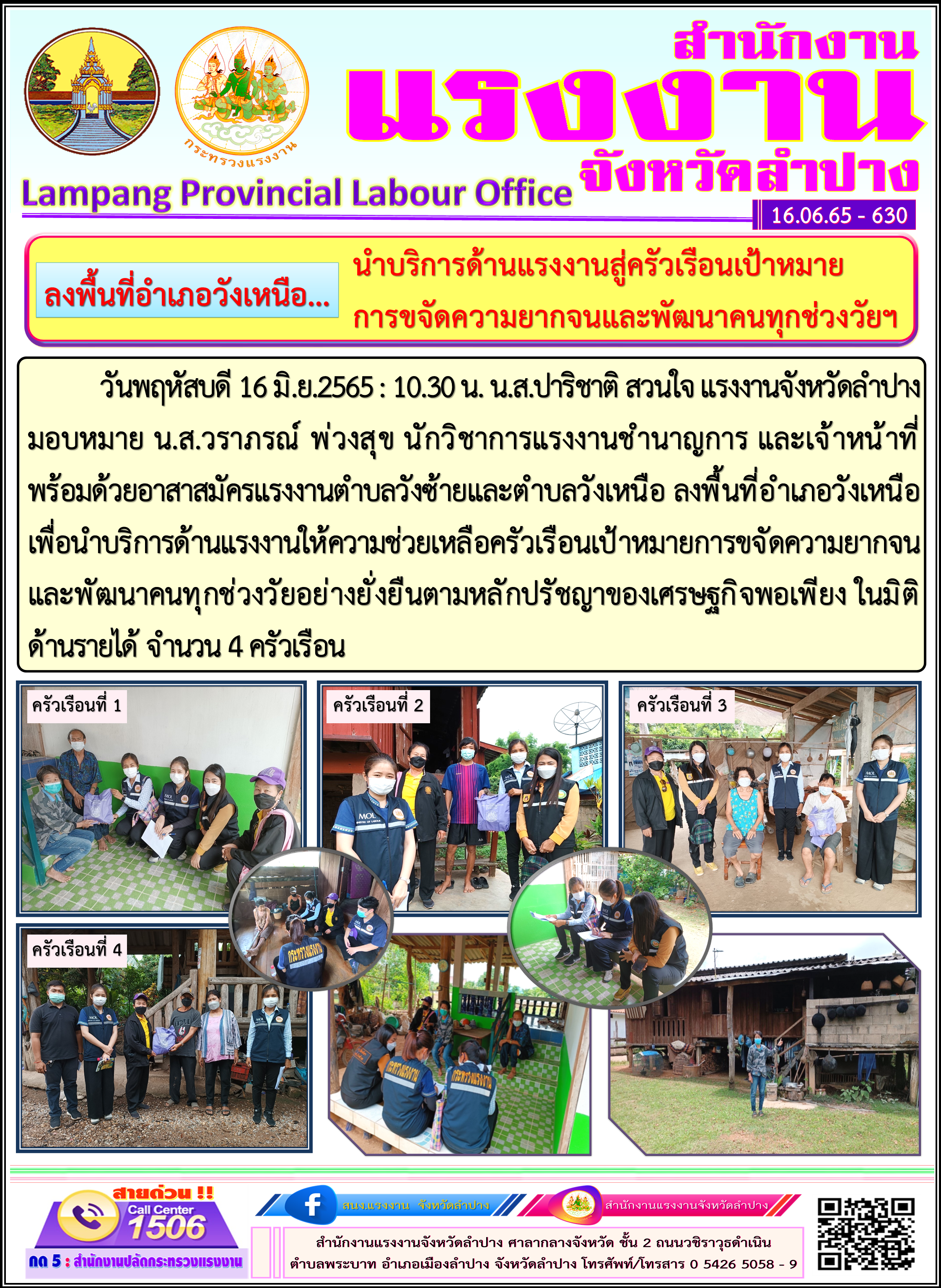 วันพฤหัสบดี 16 มิ.ย.2565 : 10.30 น. น.ส.ปาริชาติ สวนใจ แรงงานจังหวัดลำปาง มอบหมาย น.ส.วราภรณ์ พ่วงสุข นักวิชาการแรงงานชำนาญการ และเจ้าหน้าที่ พร้อมด้วยอาสาสมัครแรงงานตำบลวังซ้ายและตำบลวังเหนือ ลงพื้นที่อำเภอวังเหนือ เพื่อนำบริการด้านแรงงานให้ความช่วยเหลือครัวเรือนเป้าหมายการขจัดความยากจน และพัฒนาคนทุกช่วงวัยอย่างยั่งยืนตามหลักปรัชญาของเศรษฐกิจพอเพียงในมิติด้านรายได้ จำนวน 4 ครัวเรือน