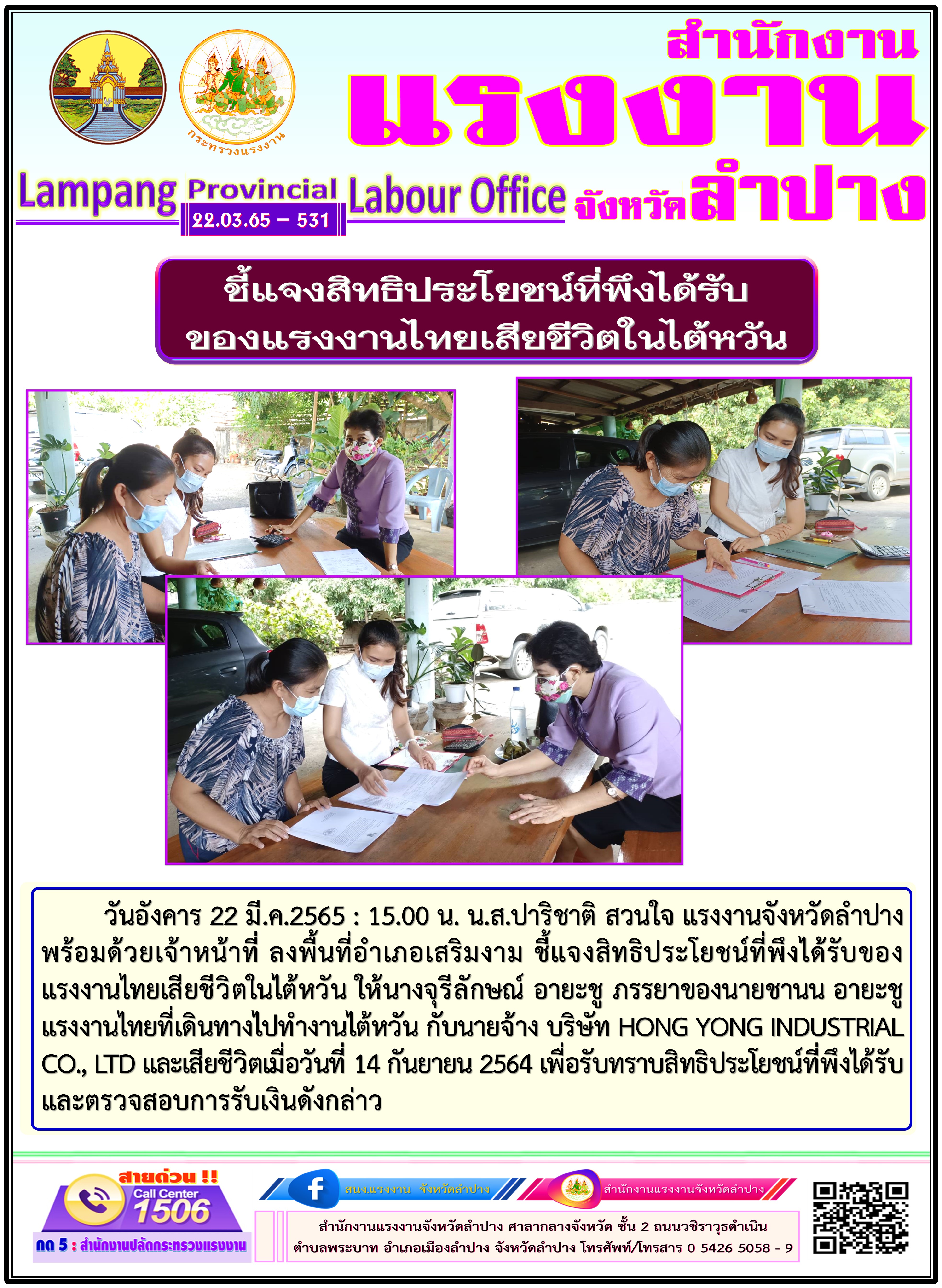 วันอังคาร 22 มี.ค.2565 เวลา 15.00 น. น.ส.ปาริชาติ สวนใจ แรงงานจังหวัดลำปาง พร้อมด้วยเจ้าหน้าที่ ลงพื้นที่อำเภอเสริมงาม ชี้แจงสิทธิประโยชน์ที่พึงได้รับของแรงงานไทยเสียชีวิตในไต้หวัน ให้นางจุรีลักษณ์ อายะชู ภรรยาของนายชานน อายะชู แรงงานไทยที่เดินทางไปทำงานไต้หวัน กับนายจ้าง บริษัท HONG YONG INDUSTRIAL CO., LTD และเสียชีวิตเมื่อวันที่ 14 กันยายน 2564 เพื่อรับทราบสิทธิประโยชน์ที่พึงได้รับและตรวจสอบการรับเงินดังกล่าว