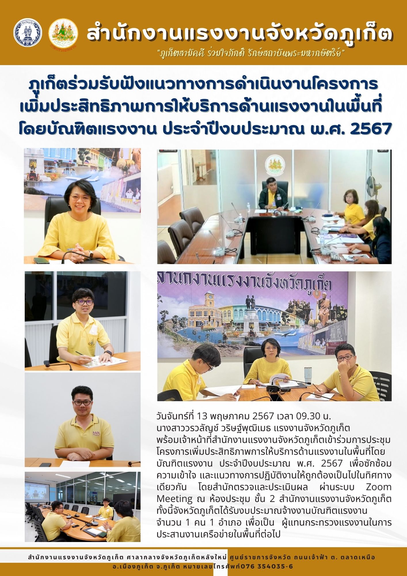 วันจันทร์ที่ 13 พฤษภาคม 2567 เวลา 09.30 น. สรจ.ภูเก็ต เข้าร่วมประชุมรับฟังแนวทางการดำเนินงานโครงการ เพิ่มประสิทธิภาพการให้บริการด้านแรงงานในพื้นที่ โดยบัณฑิตแรงงาน ประจำปีงบประมาณ พ.ศ. 2567 ผ่านระบบ Zoom Meeting