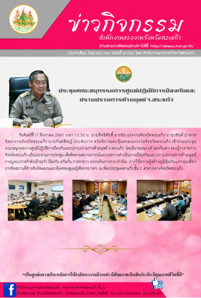 วันจันทร์ที่ 17 สิงหาคม 2561 เวลา 13.30 น. นายสิทธิศักดิ์ ธารนัย แรงงานจังหวัดสระแก้ว นายวสันต์ ปาลาส จัดหางานจังหวัดสระแก้ว นายกันตพิชญ์ ประดับการ สวัสดิการและคุ้มครองแรงงานจังหวัดสระแก้ว เข้าร่วมประชุมคณะอนุกรรมการศูนย์ปฏิบัติการป้อ