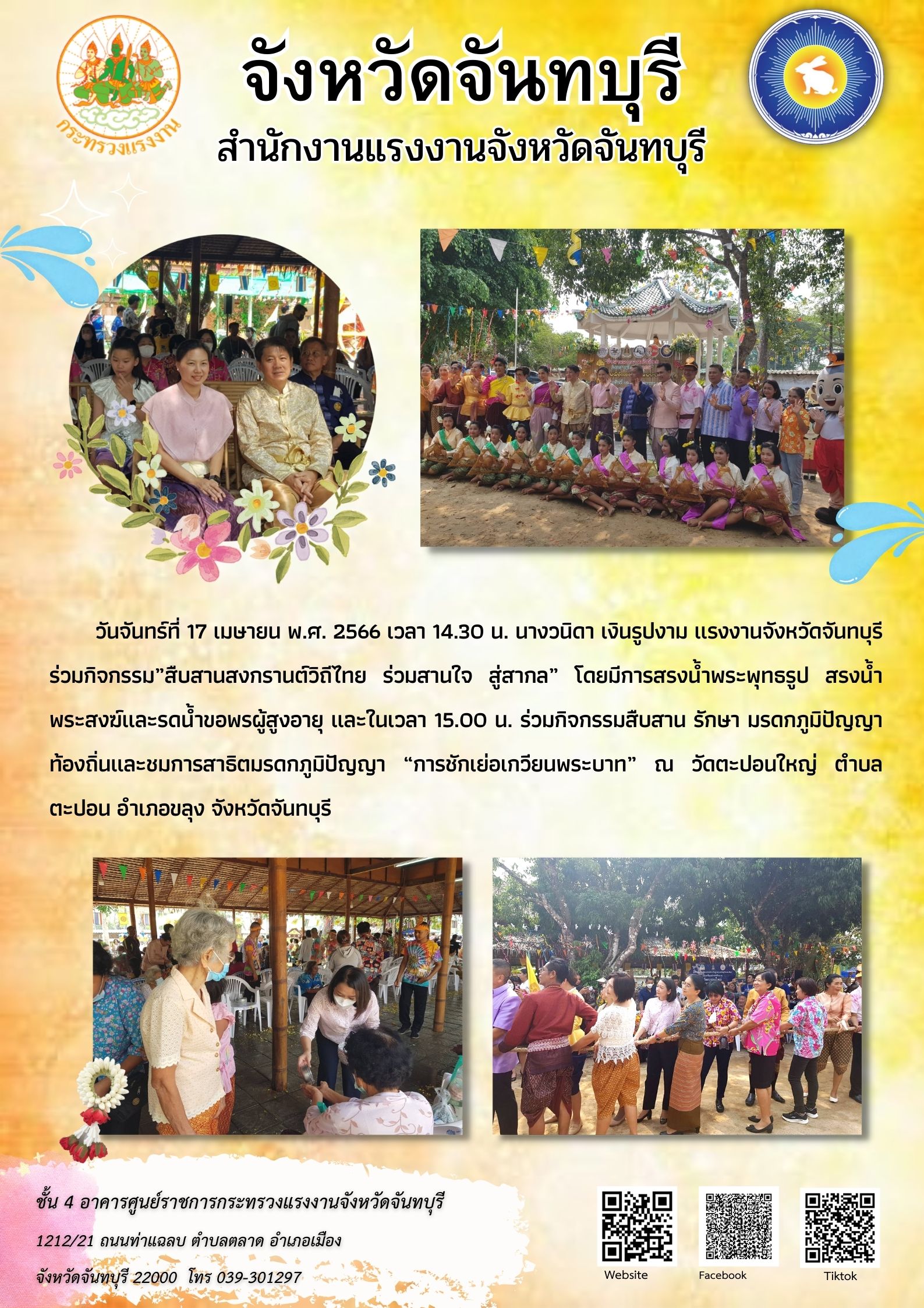 สรจ.จันทบุรี ร่วมกิจกรรม”สืบสานสงกรานต์วิถีไทย ร่วมสานใจ สู่สากล” โดยมีการสรงน้ำพระพุทธรูป สรงน้ำพระสงฆ์และรดน้ำขอพรผู้สูงอายุ และร่วมกิจกรรมสืบสาน รักษา มรดกภูมิปัญญา ท้องถิ่นและชมการสาธิตมรดกภูมิปัญญา “การชักเย่อเกวียนพระบาท”