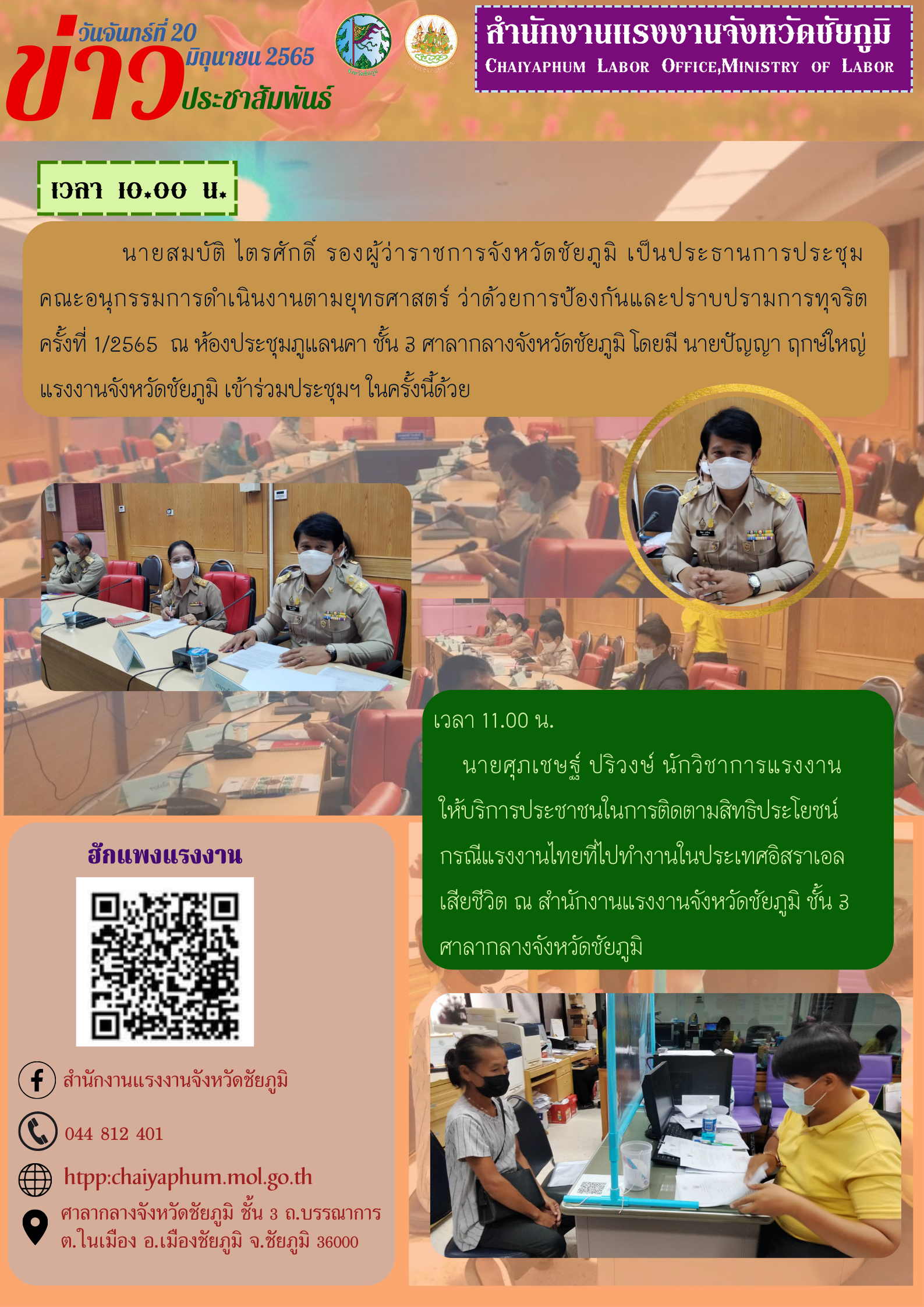 – เวลา 11.00 น. นายศุภเชษฐ์ ปริวงษ์ นักวิชาการแรงงาน ให้บริการประชาชนในการติดตามสิทธิประโยชน์กรณีแรงงานไทยที่ไปทำงานในประเทศอิสราเอล เสียชีวิต ณ สำนักงานแรงงานจังหวัดชัยภูมิ ชั้น 3 ศาลากลางจังหวัดชัยภูมิ