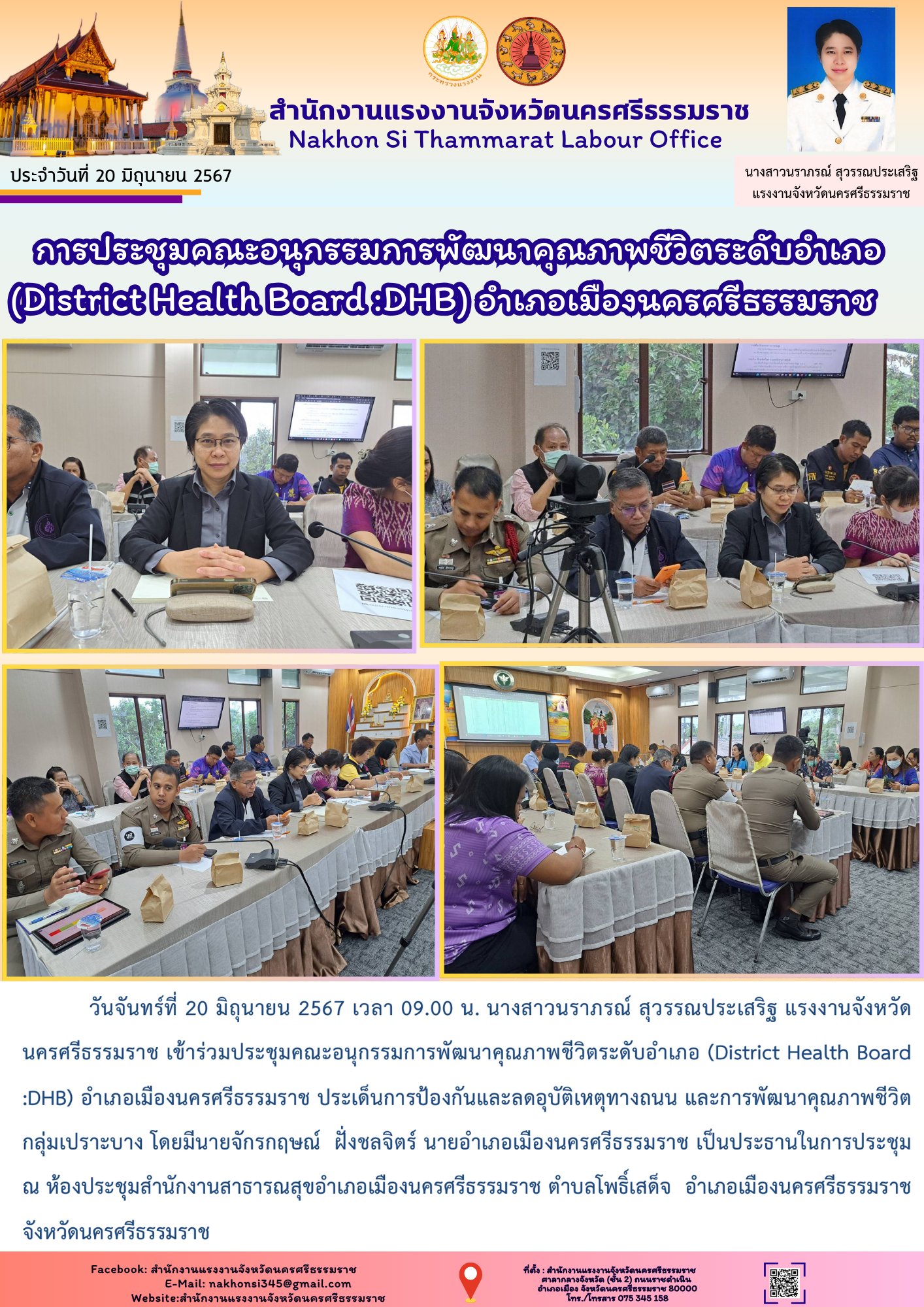 วันจันทร์ที่ 20 มิถุนายน 2567 เวลา 09.00 น. นางสาวนราภรณ์ สุวรรณประเสริฐ แรงงานจังหวัดนครศรีธรรมราช เข้าร่วมประชุมคณะอนุกรรมการพัฒนาคุณภาพชีวิตระดับอำเภอ (District Health Board :DHB) อำเภอเมืองนครศรีธรรมราช ประเด็นการป้องกันและลดอุบัติเหตุทางถนน และการพัฒนาคุณภาพชีวิตกลุ่มเปราะบาง โดยมีนายจักรกฤษณ์ ฝั่งชลจิตร์ นายอำเภอเมืองนครศรีธรรมราช เป็นประธานในการประชุม ณ ห้องประชุมสำนักงานสาธารณสุขอำเภอเมืองนครศรีธรรมราช ตำบลโพธิ์เสด็จ อำเภอเมือง จังหวัดนครศรีธรรมราช
