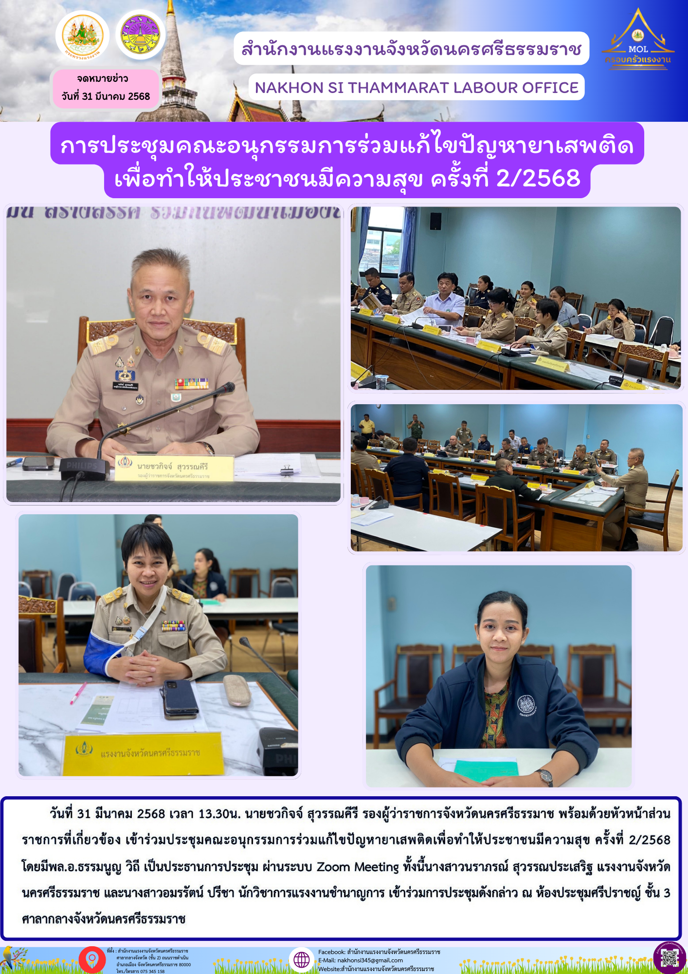 วันจันทร์ที่ 31 มีนาคม 2568 เวลา 13.30น. นายชวกิจจ์ สุวรรณคีรี รองผู้ว่าราชการจังหวัดนครศรีธรรมาช พร้อมด้วยหัวหน้าส่วนราชการที่เกี่ยวข้อง เข้าร่วมประชุมคณะอนุกรรมการร่วมแก้ไขปํญหายาเสพติดเพื่อทำให้ประชาชนมีความสุช ครั้งที่ 2/2568 โดยมี พล.อ.ธรรมนูญ วิถี เป็นประธาน ผ่านระบบสื่ออิเล็กทรอนิกส์ (ระบบ Zoom Meeting ) ทั้งนี้นางสาวนราภรณ์ สุวรรณประเสริฐ แรงงานจังหวัดนครศรีธรรมราช และนางสาวอมรรัตน์ ปรีชา นักวิชาการแรงงานชำนาญการ เข้าร่วมการประชุมดังกล่าว ณ ห้องประชุมศรีปราชญ์ ชั้น 3 ศาลากลางจังหวัดนครศรีธรรมราช