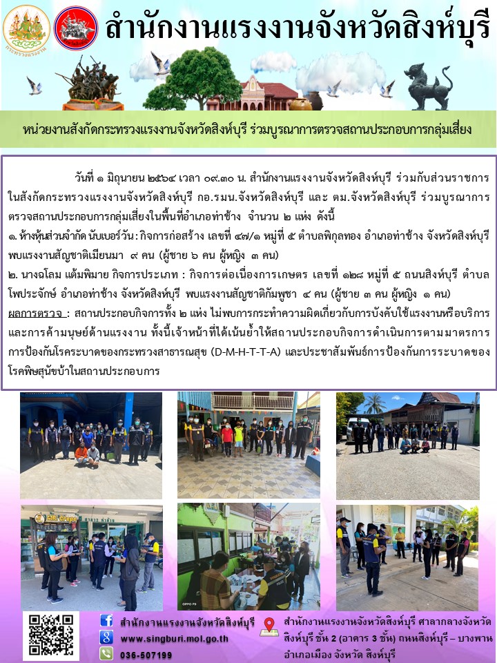 หน่วยงานสังกัดกระทรวงแรงงานจังหวัดสิงห์บุรี ร่วมบูรณาการตรวจสถานประกอบการกลุ่มเสี่ยง