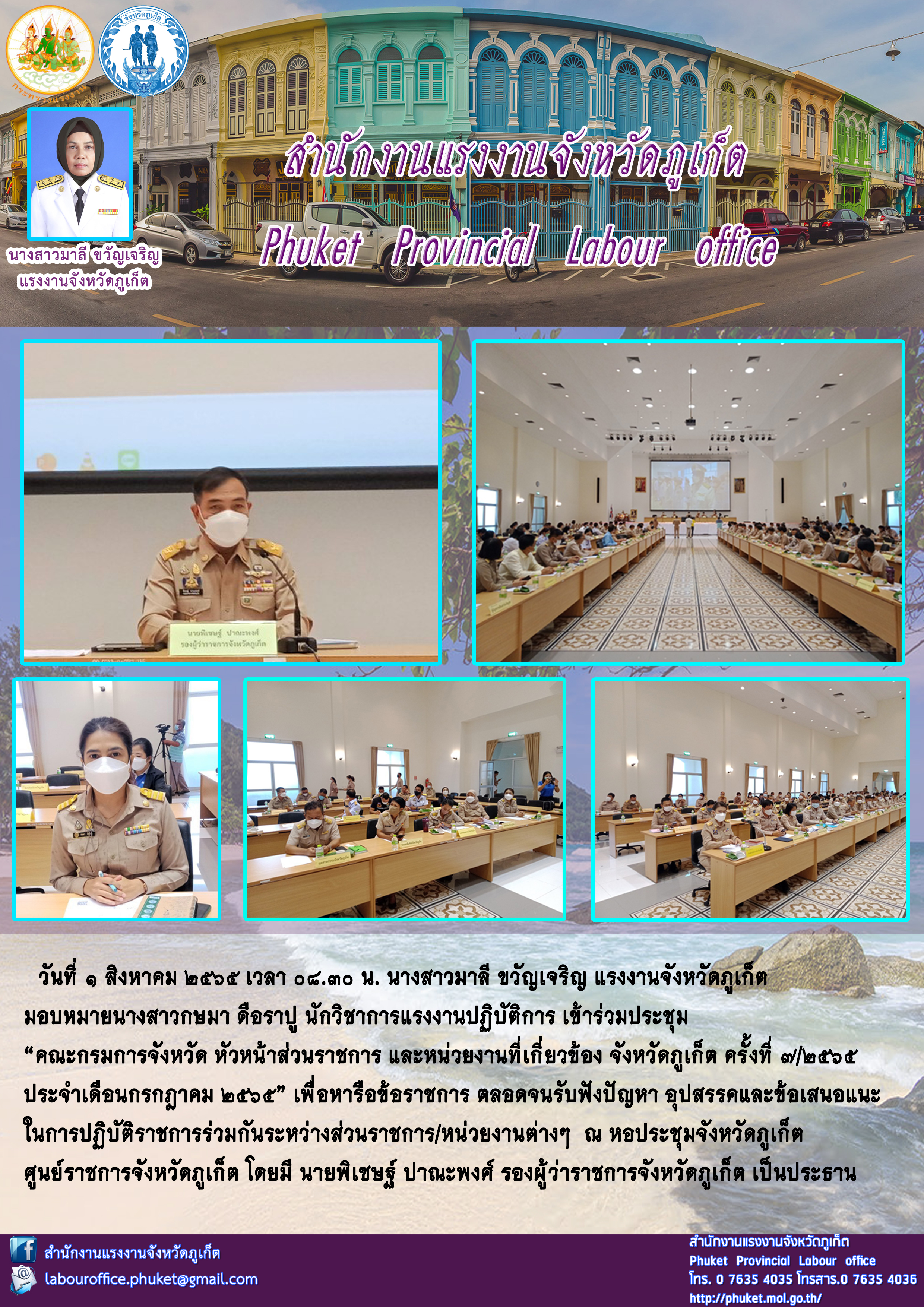 นางสาวมาลี ขวัญเจริญ แรงงานจังหวัดภูเก็ต มอบหมายนางสาวกษมา ดือราปู นักวิชาการแรงงานปฏิบัติการ เข้าร่วมประชุม “คณะกรมการจังหวัด หัวหน้าส่วนราชการ และหน่วยงานที่เกี่ยวข้อง จังหวัดภูเก็ต ครั้งที่ 7/2565 ประจำเดือนกรกฎาคม 2565”