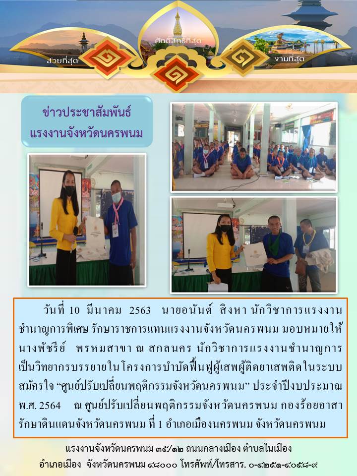 แรงงานจังหวัดนครพนม เป็นวิทยากรบรรยายใน โครงการบำบัดฟื้นฟูผู้เสพผู้ติดยาเสพติดในระบบ สมัครใจ “ศูนย์ปรับเปลี่ยนพฤติกรรมจังหวัดนคร พนม”