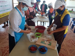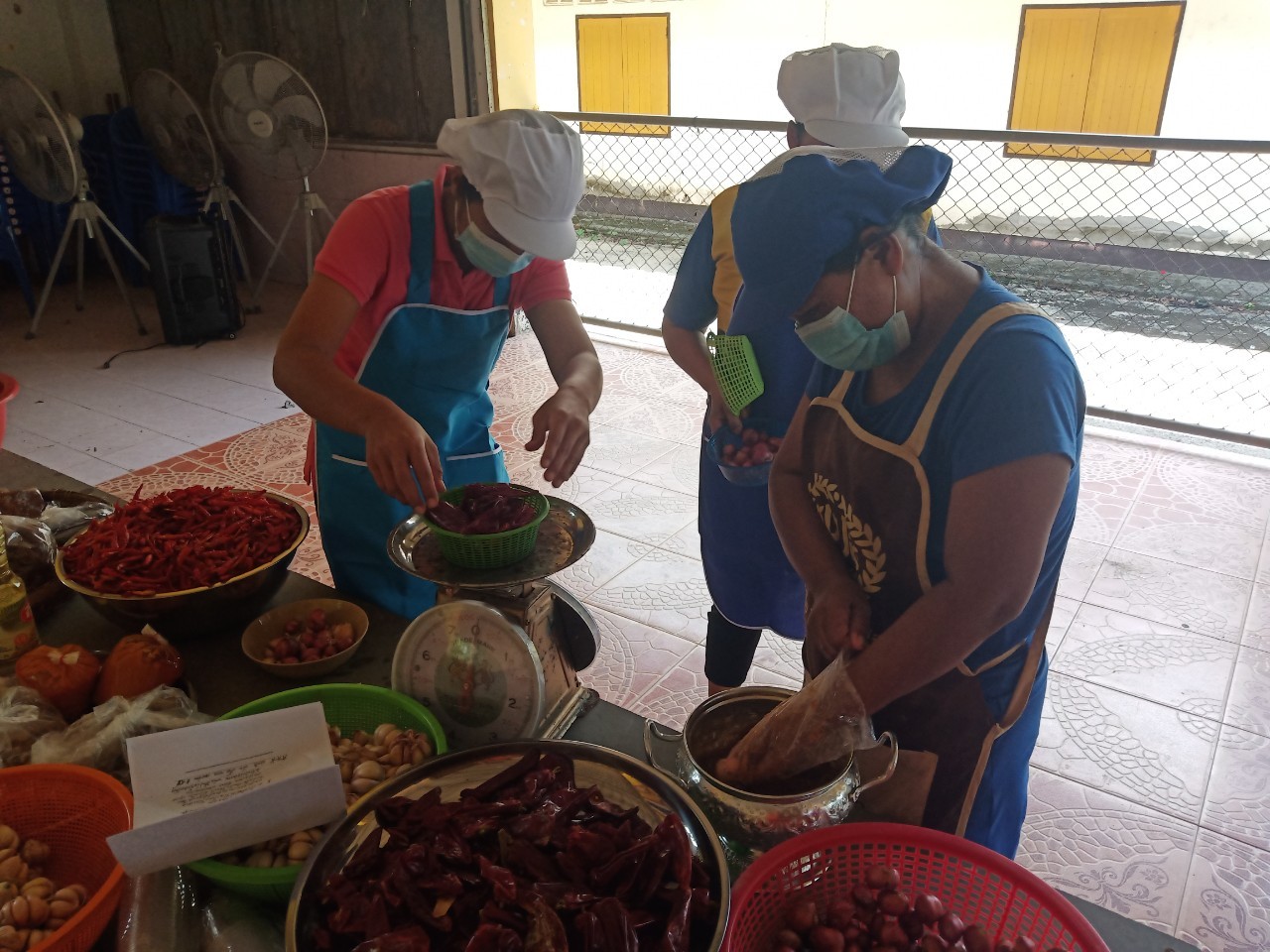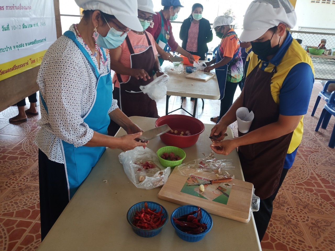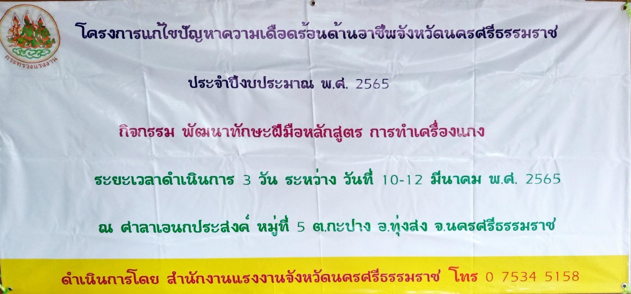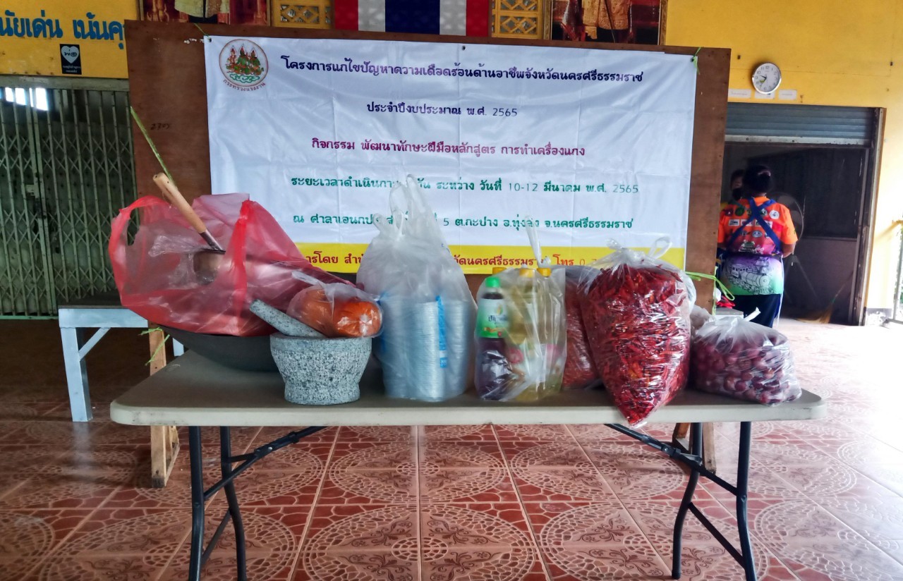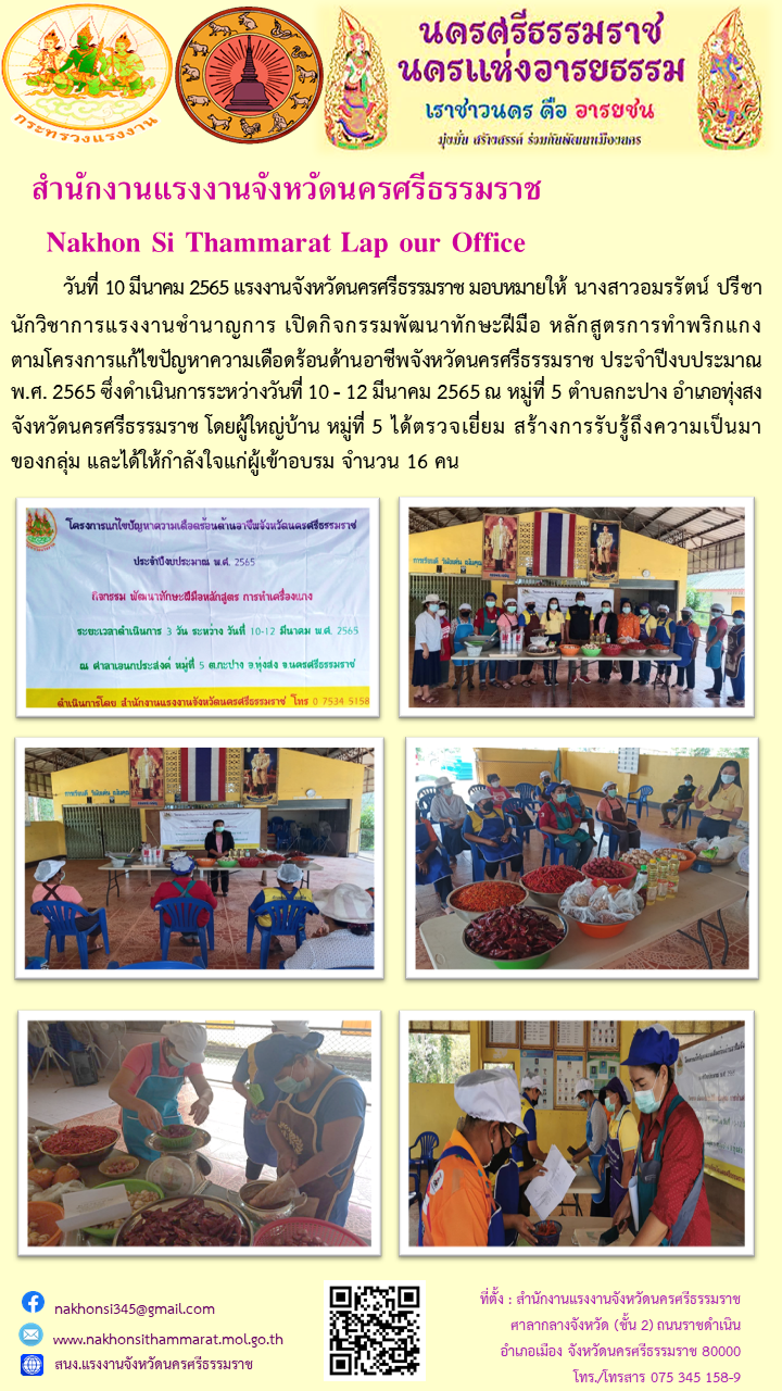 วันที่ 10 มีนาคม 2565 แรงงานจังหวัดนครศรีธรรมราช ได้มอบหมายให้นางสาวอมรรัตน์ ปรีชา นักวิชาการแรงงานชำนาญการ เปิดกิจกรรมพัฒนาทักษะฝีมือ หลักสูตรการทำพริกแกง ตามโครงการแก้ไขปัญหาความเดือดร้อนด้านอาชีพจังหวัดนครศรีธรรมราช ประจำปีงบประมาณ พ.ศ. 2565 กิจกรรมพัฒนาทักษะฝีมือ หลักสูตรการทำพริกแกง ตามโครงการแก้ไขปัญหาความเดือดร้อนด้านอาชีพจังหวัดนครศรีธรรมราช ประจำปีงบประมาณ พ.ศ. 2565 ซึ่งดำเนินการระหว่างวันที่ 10 – 12 มีนาคม 2565 ณ หมู่ที่ 5 ตำบลกะปาง อำเภอทุ่งสง จังหวัดนครศรีธรรมราช โดยผู้ใหญ่บ้าน หมู่ที่ 5 ได้ตรวจเยี่ยม สร้างการรับรู้ถึงความเป็นมาของกลุ่ม และได้ให้กำลังใจแก่ผู้เข้าอบรม จำนวน 16 คน