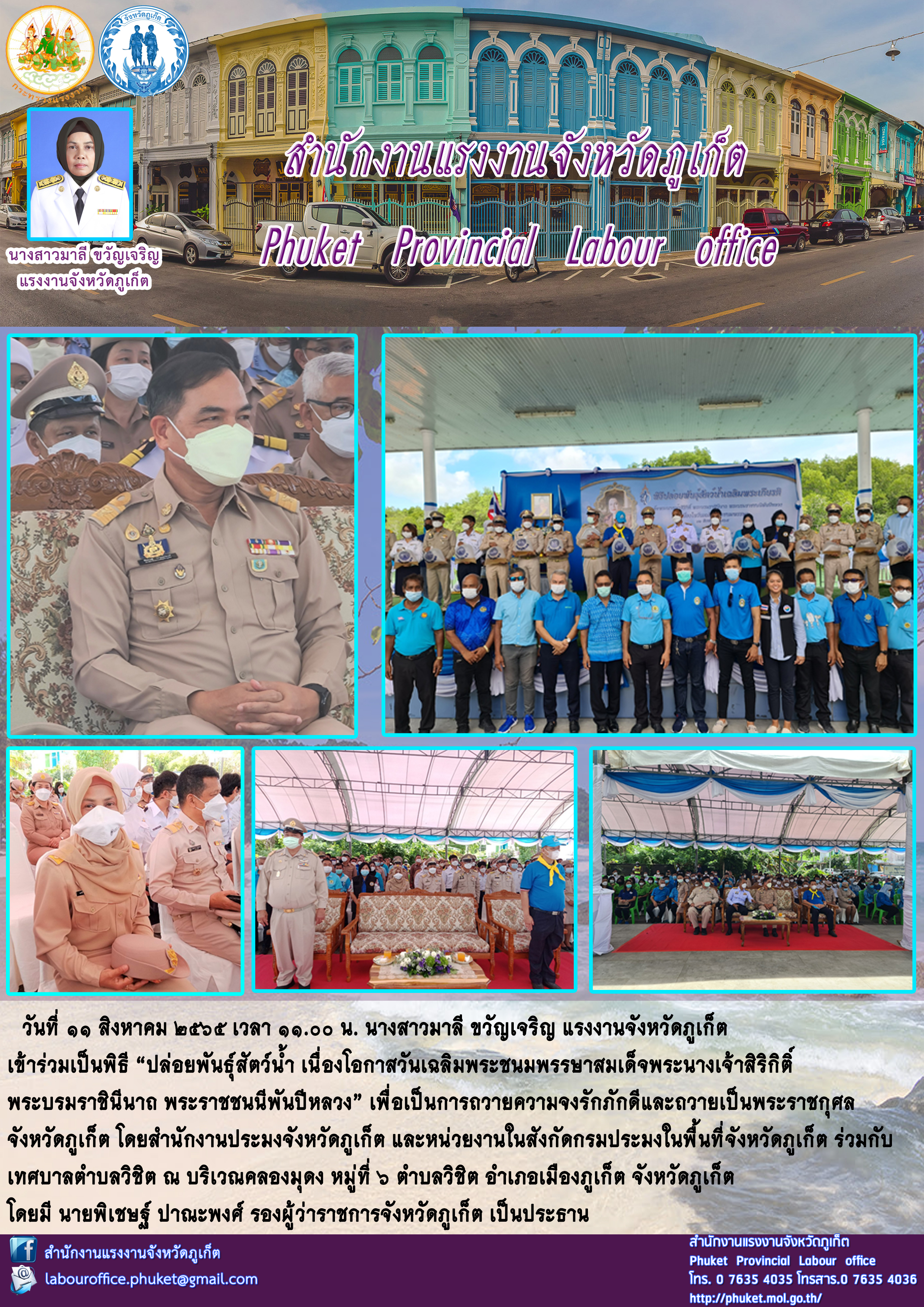 นางสาวมาลี ขวัญเจริญ แรงงานจังหวัดภูเก็ต เข้าร่วมเป็นพิธี “ปล่อยพันธุ์สัตว์น้ำ เนื่องโอกาสวันเฉลิมพระชนมพรรษาสมเด็จพระนางเจ้าสิริกิติ์ พระบรมราชินีนาถ พระราชชนนีพันปีหลวง”