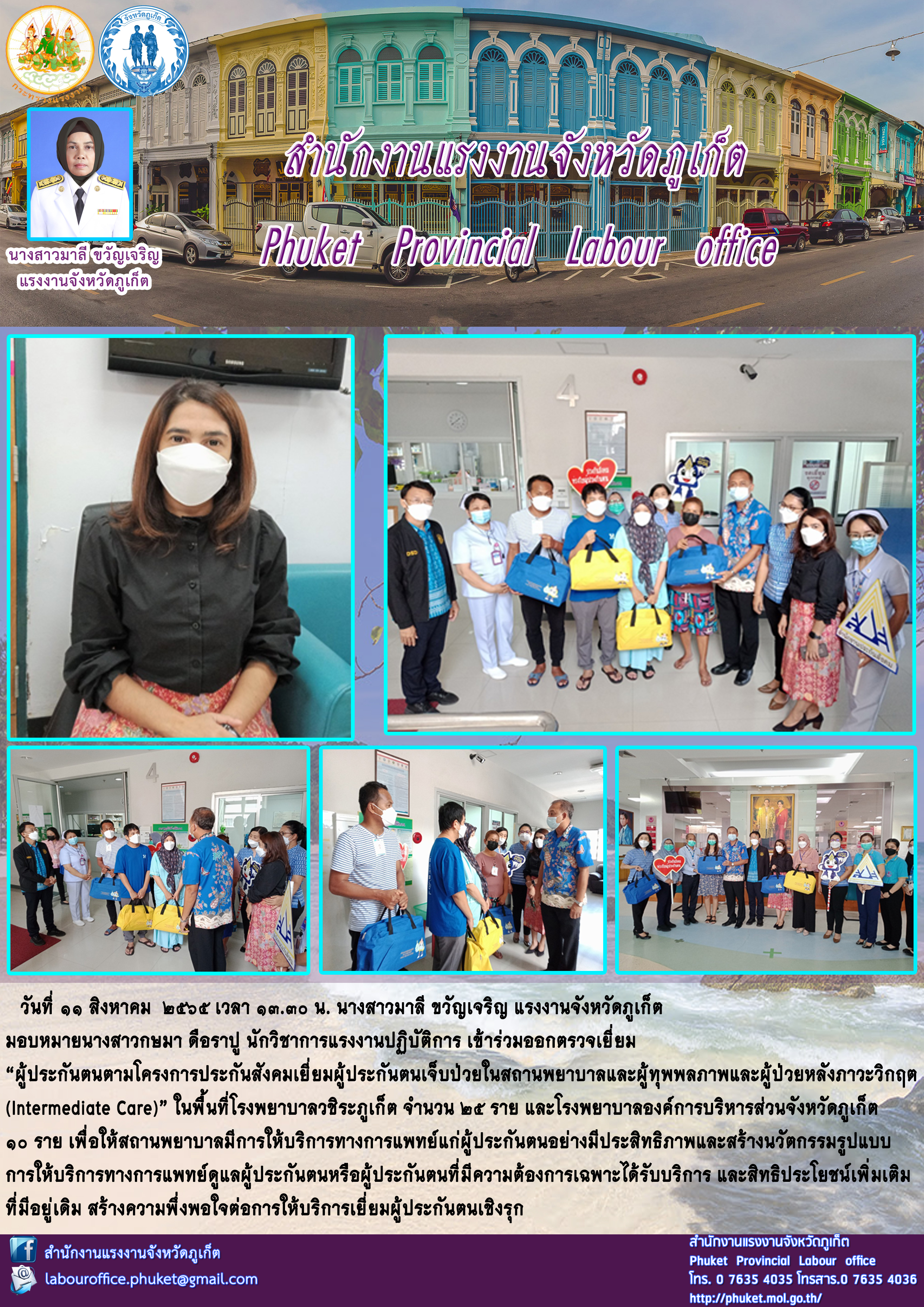นางสาวมาลี ขวัญเจริญ แรงงานจังหวัดภูเก็ต มอบหมายนางสาวกษมา ดือราปู นักวิชาการแรงงานปฏิบัติการ เข้าร่วมออกตรวจเยี่ยม “ผู้ประกันตนตามโครงการประกันสังคมเยี่ยมผู้ประกันตนเจ็บป่วยในสถานพยาบาลและผู้ทุพพลภาพและผู้ป่วยหลังภาวะวิกฤต (Intermediate Care)”