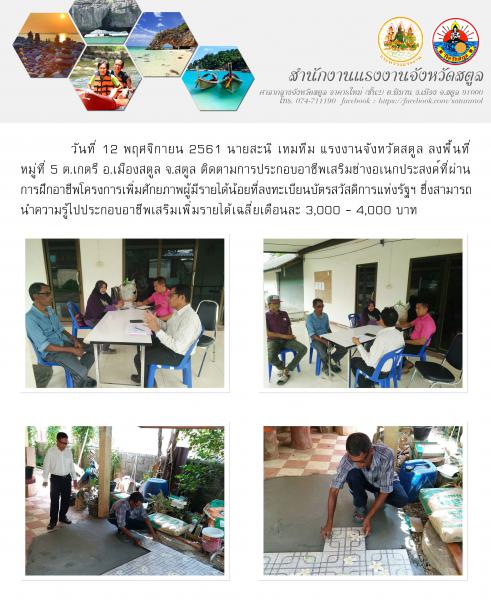 วันที่ 12 พฤศจิกายน 2561 นายสะนิ เหมหีม แรงงานจังหวัดสตูล ลงพื้นที่ติดตามการประกอบอาชีพเสริมช่างอเนกประสงค์ที่ผ่าน การฝึกอาชีพโครงการเพิ่มศักยภาพผู้มีรายได้น้อยที่ลงทะเบียนบัตรสวัสดิการแห่งรัฐฯ