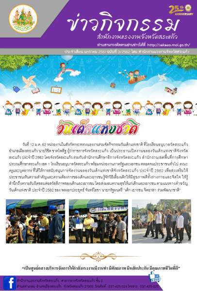วันที่ 12 ม.ค. 62 หน่วยงานในสังกัดกระทรวงแรงงานร่วมจัดกิจกรรมวันเด็กแห่งชาติ ที่โรงเรียนอนุบาลวัดสระแก้ว อำเภอเมืองสระแก้ว นายวิชิต ชาตไพสิฐ ผู้ว่าราชการจังหวัดสระแก้ว เป็นประธานเปิดงานฉลองวันเด็กแห่งชาติจังหวัดสระแก้ว ประจำปี 2562 โดยจังหวัดสระแก้ว ร่วมก